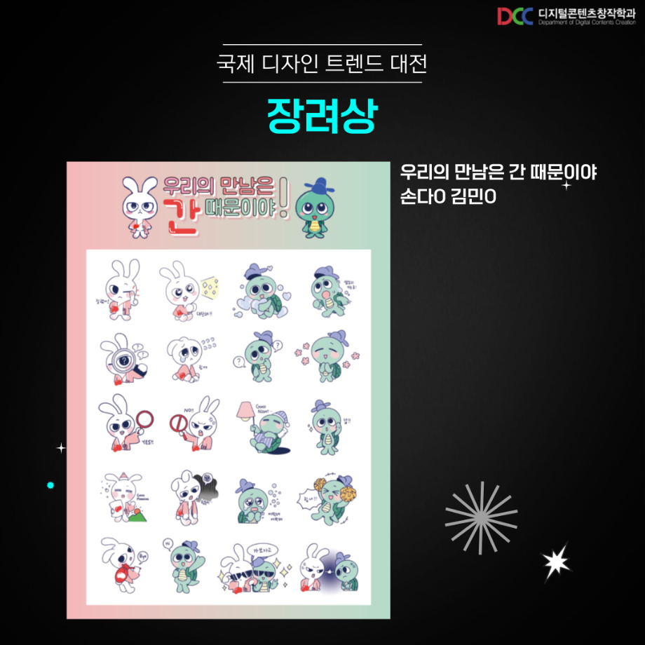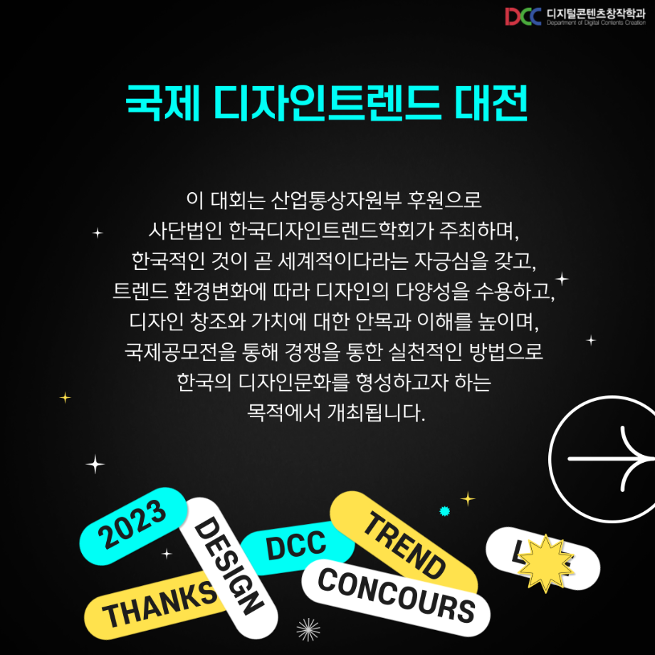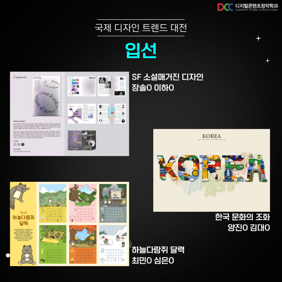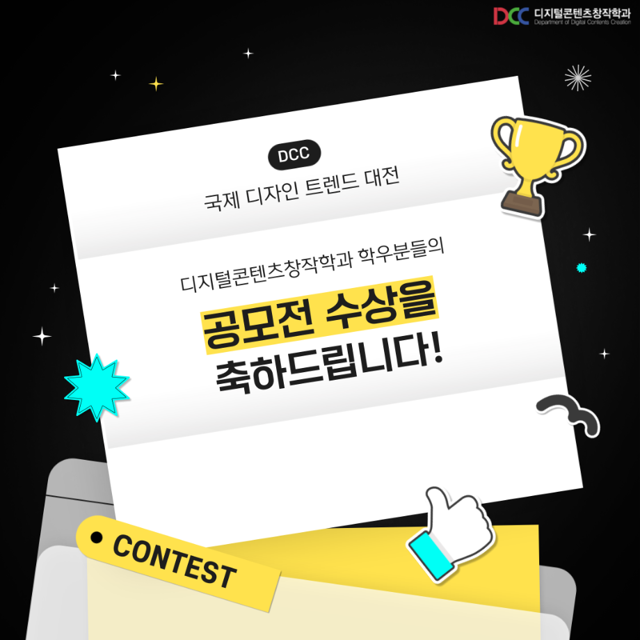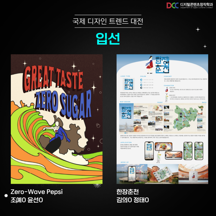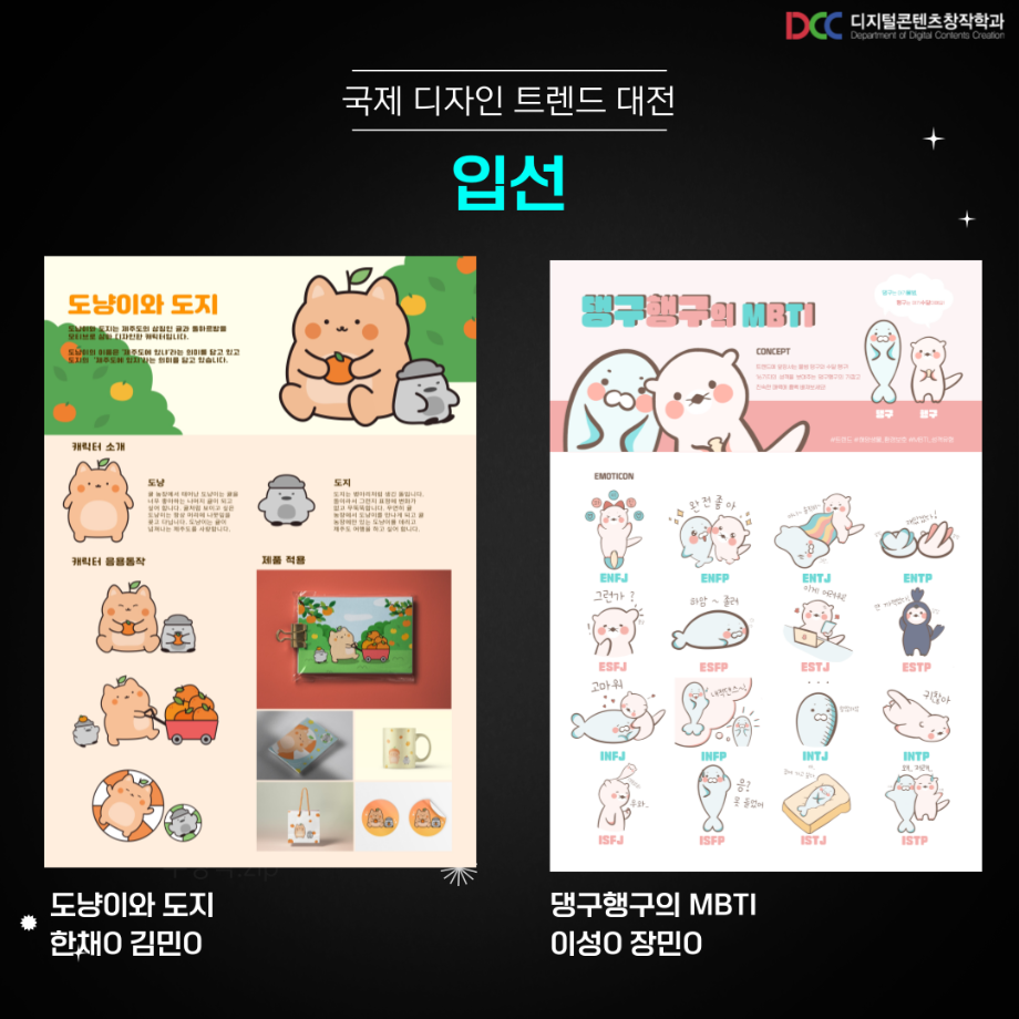 본문 시작 홈으로 MCC News 학과소개 교수소개 학과과정 MCC News MCC SNS 홈페이지가이드 학과 및 재학생 학과 및 재학생 교수 및 졸업생 미디어 정보통 학과 및 재학생 페이스북 트위터 프린트 디지털콘텐츠창작학과 재학생 국제 디자인트렌드 대전 수상 디지털콘텐츠창작학과 9573 2023-09-13 디지털콘텐츠창작학과 학우분들의 공모전 수상을 축하드립니다! 앞으로도 여러분들의 멋진 도전을 응원합니다! 목록 이전디지털콘텐츠창작학과 재학생 커뮤니케이션 국제 디자인 공모전 수상 다음 🍭 오늘의 디콘 21탄 🍭 담당부서 : 미디어콘텐츠창작학과 담당자 : - 연락처 : 043-649-1741 최종수정일 : 2024-10-26 만족도조사 만족도 조사 이 페이지에서 제공하는 정보에 대하여 만족하시나요? 매우만족 만족 보통 불만족 매우불만족