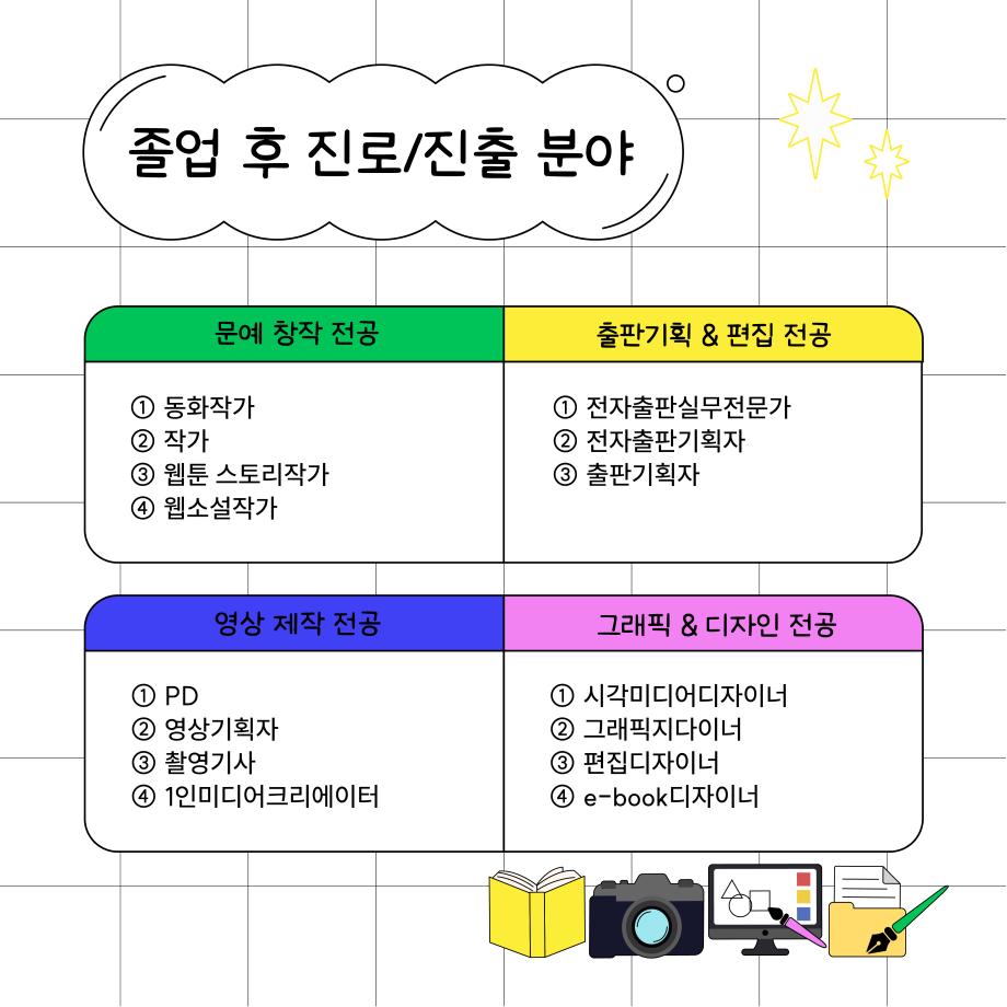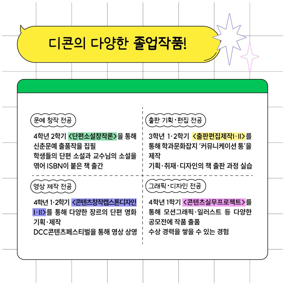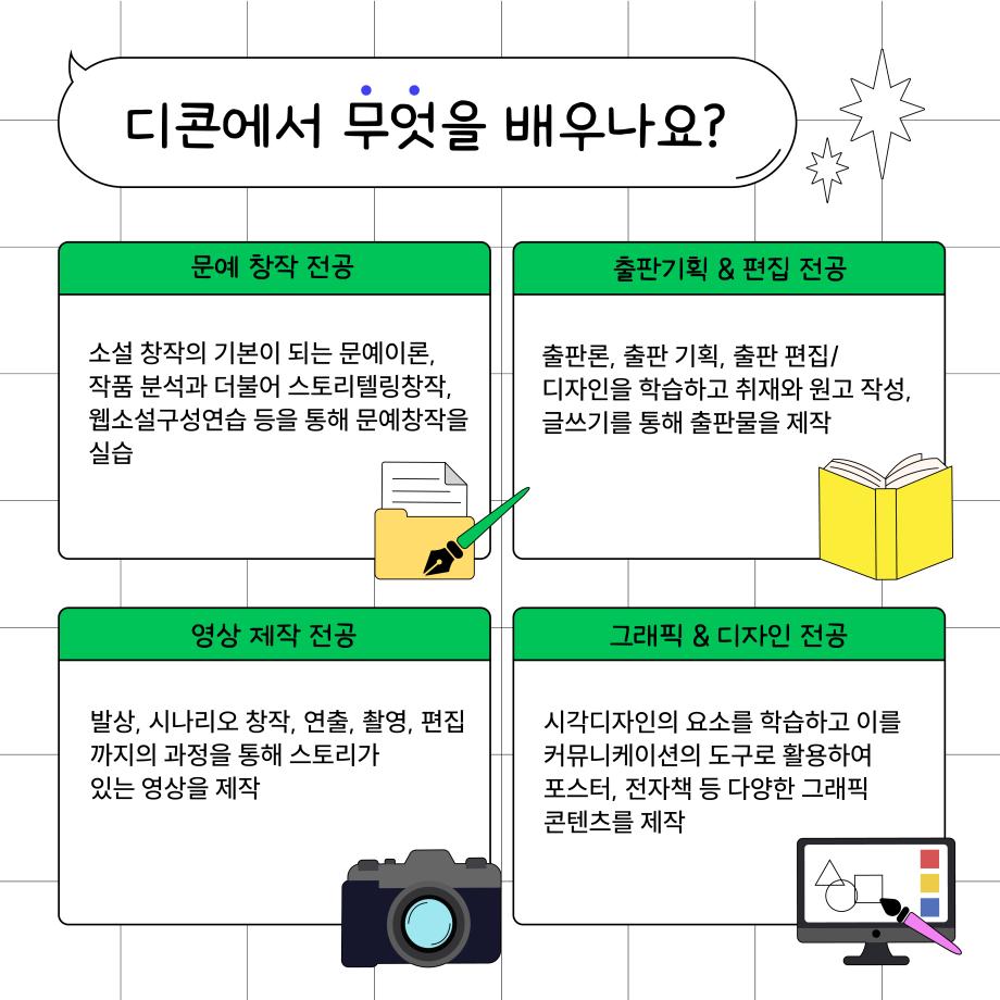본문 시작 홈으로 MCC News 학과소개 교수소개 학과과정 MCC News MCC SNS 홈페이지가이드 학과 및 재학생 학과 및 재학생 교수 및 졸업생 미디어 정보통 학과 및 재학생 페이스북 트위터 프린트 디지털콘텐츠창작학과를 알고 싶다고? 디지털콘텐츠창작학과 6935 2023-12-29 디지털콘텐츠창작학과를 알고 싶은 예비신입생을 위해 준비했습니다! 디콘에서는 무엇을 배우는지, 어떤 졸업작품을 만드는지 등 궁금한 점을 정리해두었으니 참고하시면 좋을 것 같아요 목록 이전🎞제21회 DCC콘텐츠페스티벌 4학년 졸업작품 상영회🎞 다음 멋진 작품을 뽐내봐! 2023 캡스톤디자인 경진대회 대상: 디지털콘텐츠창작학과 깻잎방범대 팀 담당부서 : 미디어콘텐츠창작학과 담당자 : - 연락처 : 043-649-1741 최종수정일 : 2024-10-26 만족도조사 만족도 조사 이 페이지에서 제공하는 정보에 대하여 만족하시나요? 매우만족 만족 보통 불만족 매우불만족