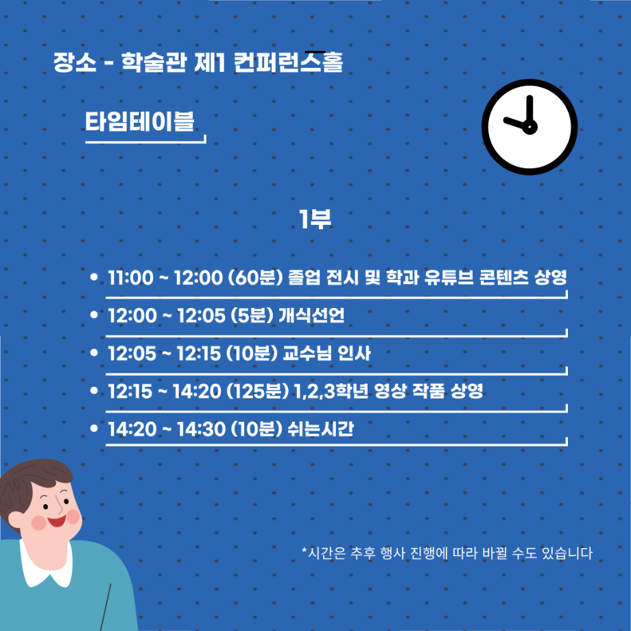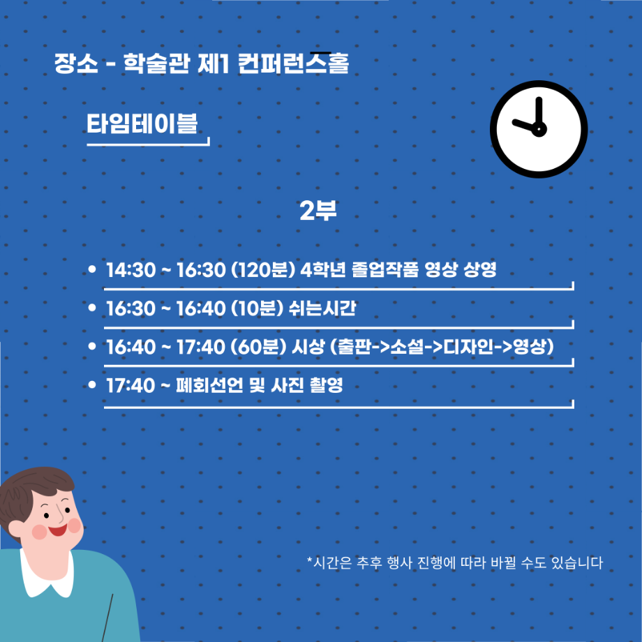 본문 시작 홈으로 MCC News 학과소개 교수소개 학과과정 MCC News MCC SNS 홈페이지가이드 학과 및 재학생 학과 및 재학생 교수 및 졸업생 미디어 정보통 학과 및 재학생 페이스북 트위터 프린트 🎊제22회 DCC 페스티벌🎊 미디어콘텐츠창작학과 2495 2024-11-27 디지털콘텐츠창작학과에서 학기 마지막 행사인 DCC페스티벌을 진행합니다! DCC 페스티벌은 1년동안 학과 학우분들이 제작한 영상, 소설, 디자인, 출판등을 전시 및 상영하는 행사이며 학과의 가장 큰 행사입니다. 일시 - 2024년 12월 3일 화요일 11시 장소 - 학술관 제1컨퍼런스홀 디지털콘텐츠창작학과 이름으로 하는 마지막 행사이자 학우여러분들의 1년동안의 과정, 성과를 볼 수 있는 행사이니 많은 관심과 참여 부탁드립니다! 목록 이전🕵🏻♂미디어콘텐츠창작학과 추리 방탈출🔎 다음 DCC 콘텐츠 페스티벌이 무사히 끝났습니다. 담당부서 : 미디어콘텐츠창작학과 담당자 : - 연락처 : 043-649-1741 최종수정일 : 2024-10-26 만족도조사 만족도 조사 이 페이지에서 제공하는 정보에 대하여 만족하시나요? 매우만족 만족 보통 불만족 매우불만족