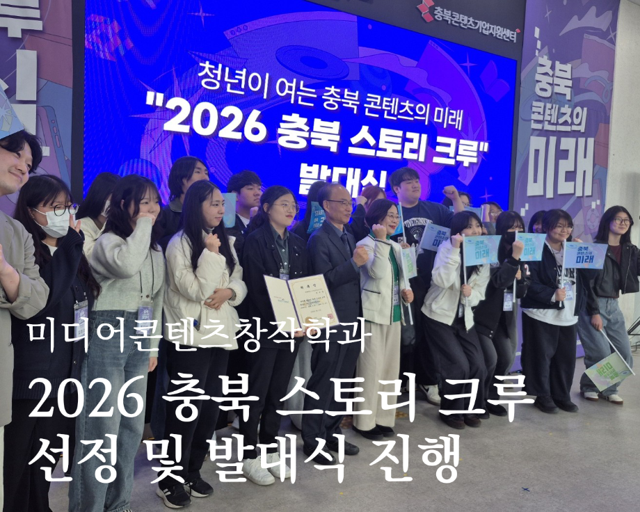 본문 시작 홈으로 MCC News 학과소개 교수소개 학과과정 MCC News MCC SNS 홈페이지가이드 학과 및 재학생 학과 및 재학생 교수 및 졸업생 미디어 정보통 학과 및 재학생 페이스북 트위터 프린트 2026 충북 스토리 크루 선정 및 발대식 진행 미디어콘텐츠창작학과 279 2026-03-28 충북과학기술혁신원에서 주최하는 2026 충북 스토리 크루(콘텐츠 청년 연구단)에 세명대학교 미디어콘텐츠창작학과가 선정되어 지도교수 및 학생들이 발대식에 참여하였습니다. 목록 다음 제14회 24시간 필름 페스티벌 담당부서 : 미디어콘텐츠창작학과 담당자 : - 연락처 : 043-649-1741 최종수정일 : 2024-10-26 만족도조사 만족도 조사 이 페이지에서 제공하는 정보에 대하여 만족하시나요? 매우만족 만족 보통 불만족 매우불만족