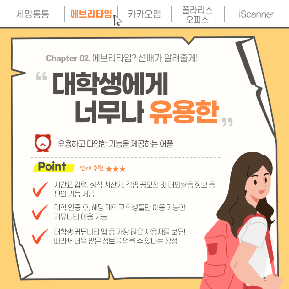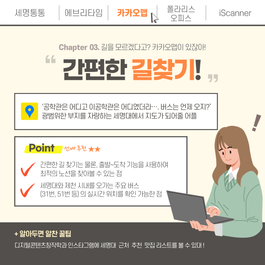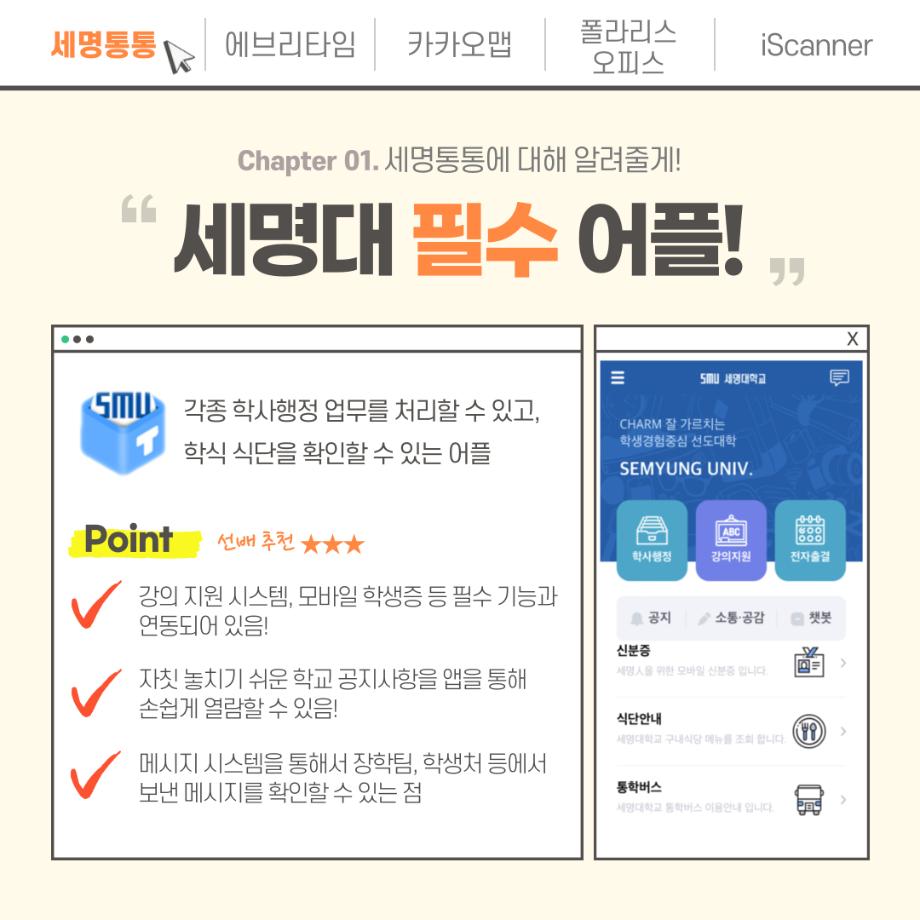본문 시작 홈으로 MCC News 학과소개 교수소개 학과과정 MCC News MCC SNS 홈페이지가이드 학과 및 재학생 학과 및 재학생 교수 및 졸업생 미디어 정보통 학과 및 재학생 페이스북 트위터 프린트 세명인이라면 알아야 할 꿀팁 앱 디지털콘텐츠창작학과 4182 2023-01-27 세명대 학생이라면 반드시 깔아야 할 앱과 필수는 아니지만 도움이 될 수 있는 앱을 추천합니다! 추천해 드린 앱과 함께 학교생활에 도움이 되었으면 좋겠습니다~ 목록 이전설날 맞이 영화 추천 다음 2023학년도 교외 공모전을 알려드려요 담당부서 : 미디어콘텐츠창작학과 담당자 : - 연락처 : 043-649-1741 최종수정일 : 2024-10-26 만족도조사 만족도 조사 이 페이지에서 제공하는 정보에 대하여 만족하시나요? 매우만족 만족 보통 불만족 매우불만족