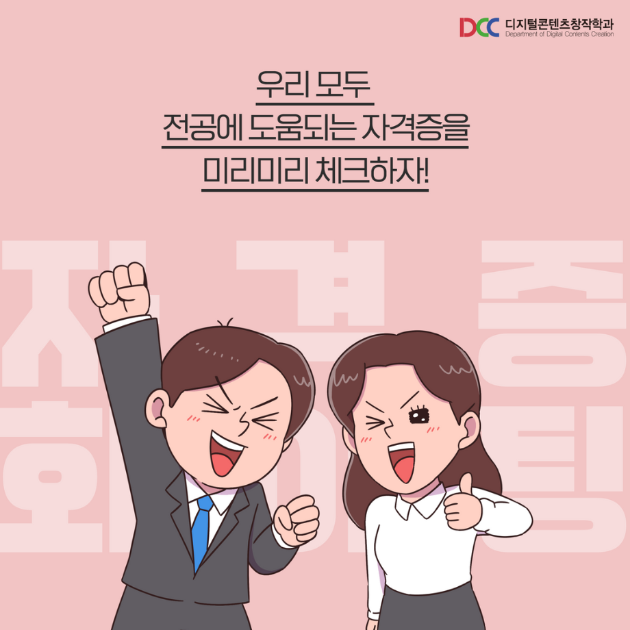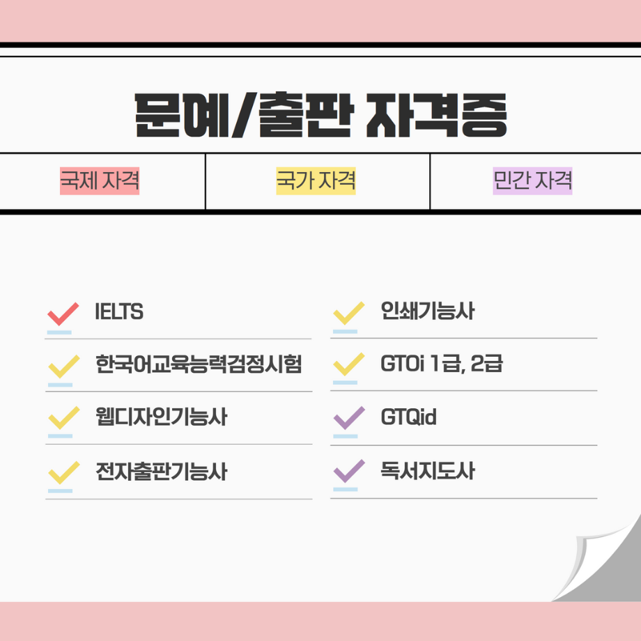 본문 시작 홈으로 MCC News 학과소개 교수소개 학과과정 MCC News MCC SNS 홈페이지가이드 학과 및 재학생 학과 및 재학생 교수 및 졸업생 미디어 정보통 학과 및 재학생 페이스북 트위터 프린트 미리 취득하면 도움 되는 자격증📝 디지털콘텐츠창작학과 5864 2023-04-07 문예,출판 관련 자격증을 알려드립니다! 자격증은 국제/국가/민간으로 나뉘며 총 6개의 자격증이 있습니다! 각 전공에 도움 되는 자격증을 미리 확인하여 취득할 수 있는 기회를 놓치지 마세요! 목록 이전🍭 오늘의 디콘 13탄 🍭 다음 🍭 오늘의 디콘 14탄 🍭 담당부서 : 미디어콘텐츠창작학과 담당자 : - 연락처 : 043-649-1741 최종수정일 : 2024-10-26 만족도조사 만족도 조사 이 페이지에서 제공하는 정보에 대하여 만족하시나요? 매우만족 만족 보통 불만족 매우불만족
