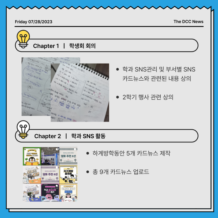 본문 시작 홈으로 MCC News 학과소개 교수소개 학과과정 MCC News MCC SNS 홈페이지가이드 학과 및 재학생 학과 및 재학생 교수 및 졸업생 미디어 정보통 학과 및 재학생 페이스북 트위터 프린트 📝디콘창 학생회 월말결산 디지털콘텐츠창작학과 4425 2023-07-28 학생회가 하는 일이 궁금하시다고요? “디콘창 학생회 월말 결산”을 통해 학생회가 무슨 일을 했는지 알려드립니다🤗 매달 마지막 주에 업로드될 예정이니 많은 관심 부탁드려요!! 목록 이전학생회가 알려주는 연계전공📚 다음 세명대학교 홈페이지 공지사항 정리 담당부서 : 미디어콘텐츠창작학과 담당자 : - 연락처 : 043-649-1741 최종수정일 : 2024-10-26 만족도조사 만족도 조사 이 페이지에서 제공하는 정보에 대하여 만족하시나요? 매우만족 만족 보통 불만족 매우불만족