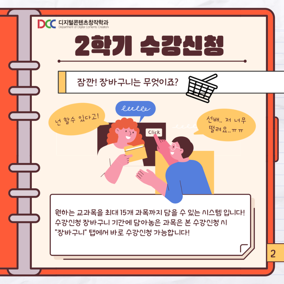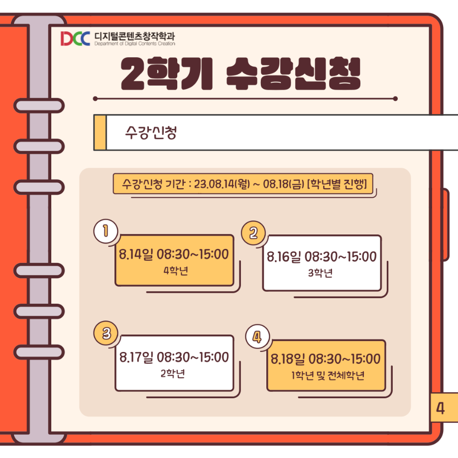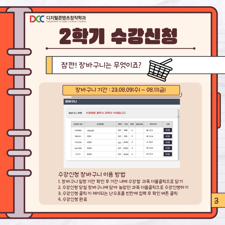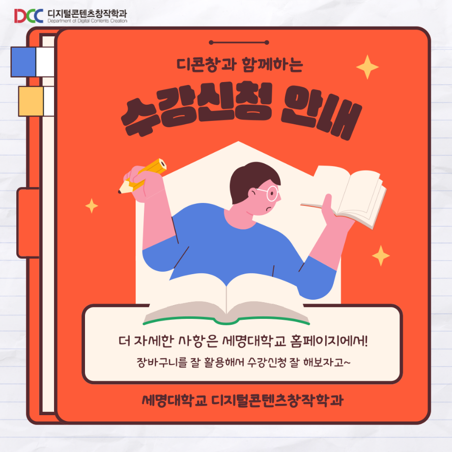 본문 시작 홈으로 MCC News 학과소개 교수소개 학과과정 MCC News MCC SNS 홈페이지가이드 학과 및 재학생 학과 및 재학생 교수 및 졸업생 미디어 정보통 학과 및 재학생 페이스북 트위터 프린트 📚디콘창이 알려주는 수강신청 안내📚 디지털콘텐츠창작학과 3565 2023-08-10 디콘창이 알려주는 수강신청 방법을 통해 모두 올클! 성공하시길 바라요! 자세한 사항은 세명대학교 홈페이지를 통해 확인할 수 있습니다! 모두들 수강신청 화이팅하시길 바라요!! 목록 이전🍭 오늘의 디콘 19탄 🍭 다음 23년도 교외 공모전 알려드려요‼ 3탄 담당부서 : 미디어콘텐츠창작학과 담당자 : - 연락처 : 043-649-1741 최종수정일 : 2024-10-26 만족도조사 만족도 조사 이 페이지에서 제공하는 정보에 대하여 만족하시나요? 매우만족 만족 보통 불만족 매우불만족