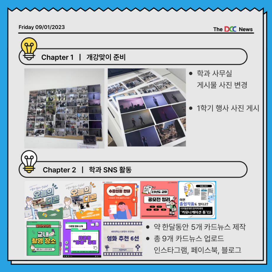 본문 시작 홈으로 MCC News 학과소개 교수소개 학과과정 MCC News MCC SNS 홈페이지가이드 학과 및 재학생 학과 및 재학생 교수 및 졸업생 미디어 정보통 학과 및 재학생 페이스북 트위터 프린트 📝디콘창 학생회 8월 월말결산 디지털콘텐츠창작학과 6657 2023-09-01 학생회가 하는 일이 궁금하시다고요? “디콘창 학생회 월말 결산”을 통해 학생회가 무슨 일을 했는지 알려드립니다🤗 매달 마지막 주에 업로드될 예정이니 많은 관심 부탁드려요!! 목록 이전디콘창이 추천하는 영화 추천 6선 6탄 다음 디지털콘텐츠창작학과, 장학금 마련을 위한 양심책방 운영 담당부서 : 미디어콘텐츠창작학과 담당자 : - 연락처 : 043-649-1741 최종수정일 : 2024-10-26 만족도조사 만족도 조사 이 페이지에서 제공하는 정보에 대하여 만족하시나요? 매우만족 만족 보통 불만족 매우불만족