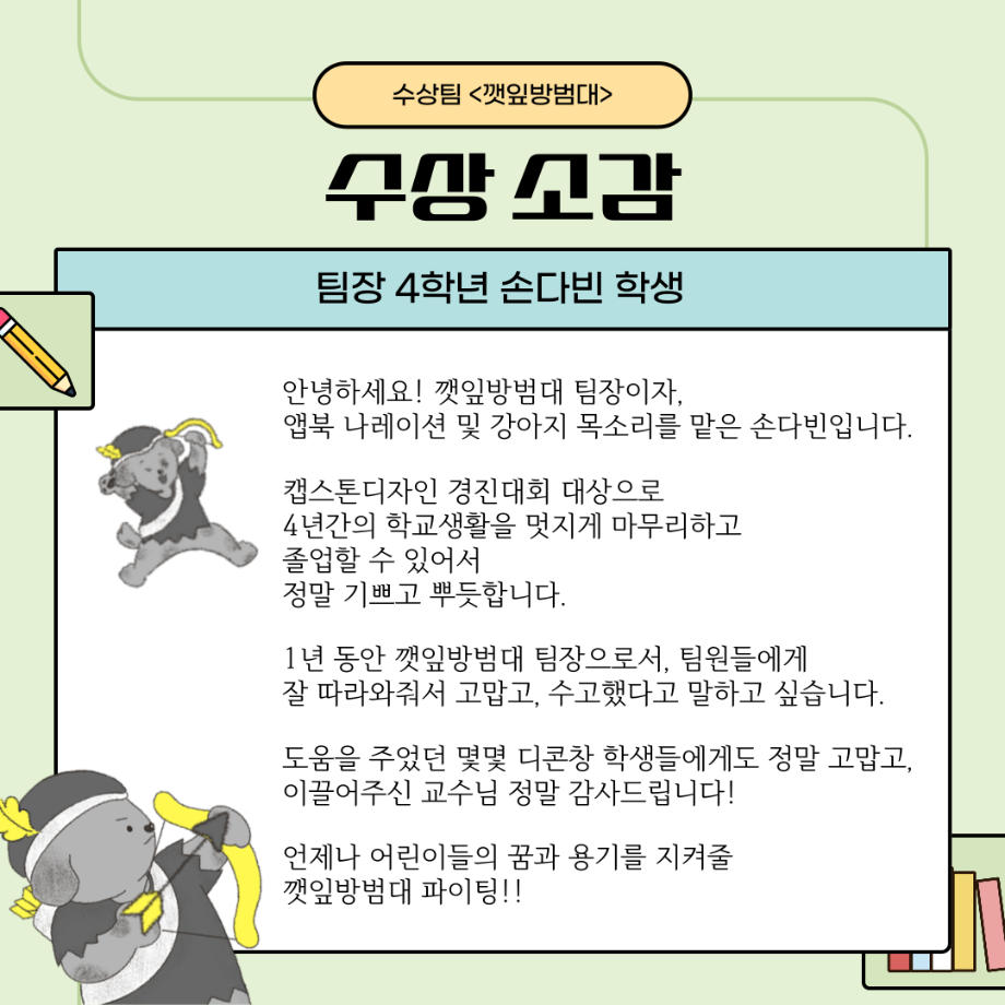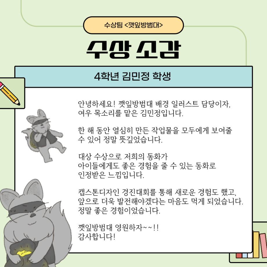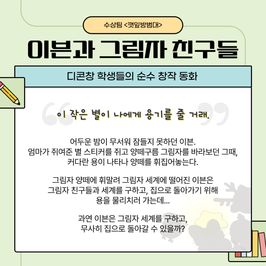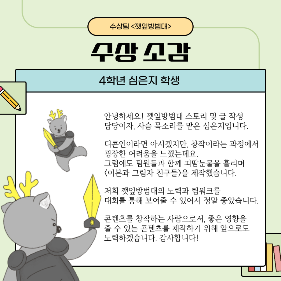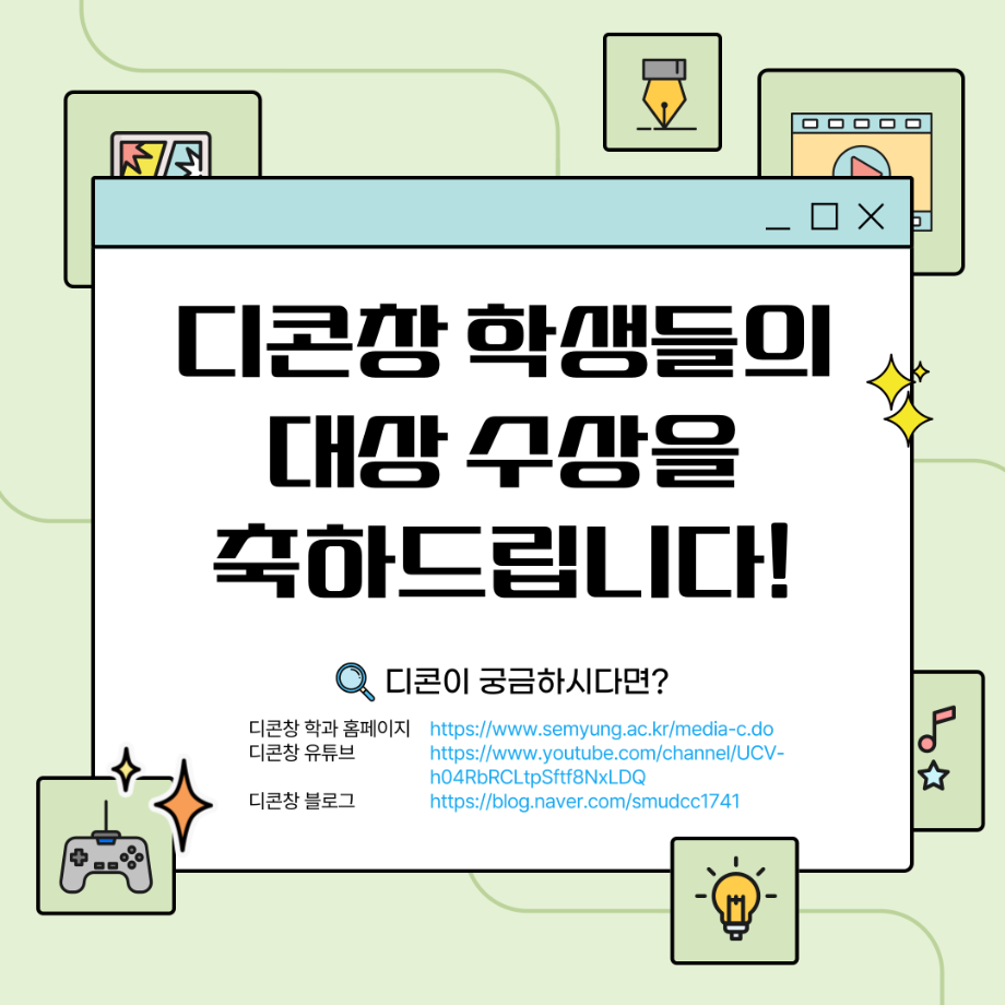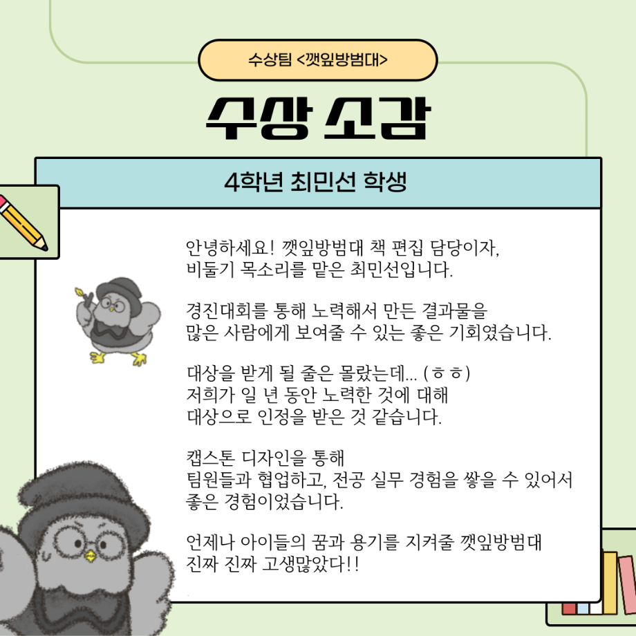 본문 시작 홈으로 MCC News 학과소개 교수소개 학과과정 MCC News MCC SNS 홈페이지가이드 학과 및 재학생 학과 및 재학생 교수 및 졸업생 미디어 정보통 학과 및 재학생 페이스북 트위터 프린트 “이븐과 그림자 친구들”팀이 2023 캡스톤디자인 경진대회에서 대상을 수상하였습니다🎊 디지털콘텐츠창작학과 2558 2023-12-14 이븐과 그림자 친구들에 대한 이야기가 담겨져 있으니 많은 관심 부탁드립니다!! 수상 축하드려요~!! 목록 이전디지털콘텐츠창작학과, 방송 콘텐츠 제작 전문가 특강 및 실습 진행 다음 2023학년도 <커뮤니케이션 통> e-Book 발간! 담당부서 : 미디어콘텐츠창작학과 담당자 : - 연락처 : 043-649-1741 최종수정일 : 2024-10-26 만족도조사 만족도 조사 이 페이지에서 제공하는 정보에 대하여 만족하시나요? 매우만족 만족 보통 불만족 매우불만족