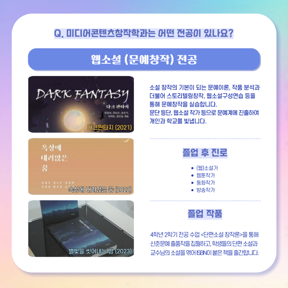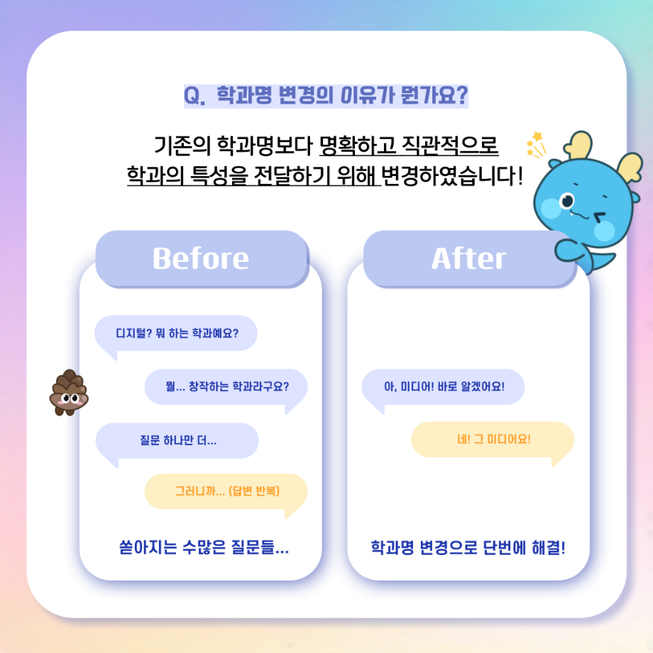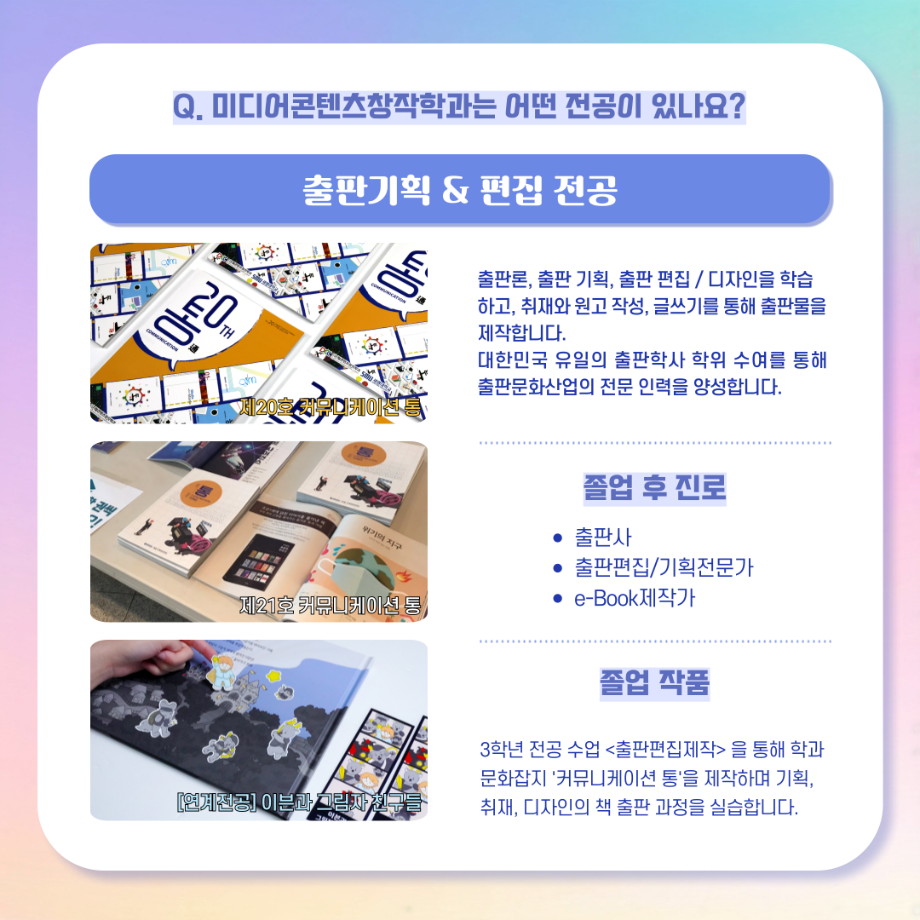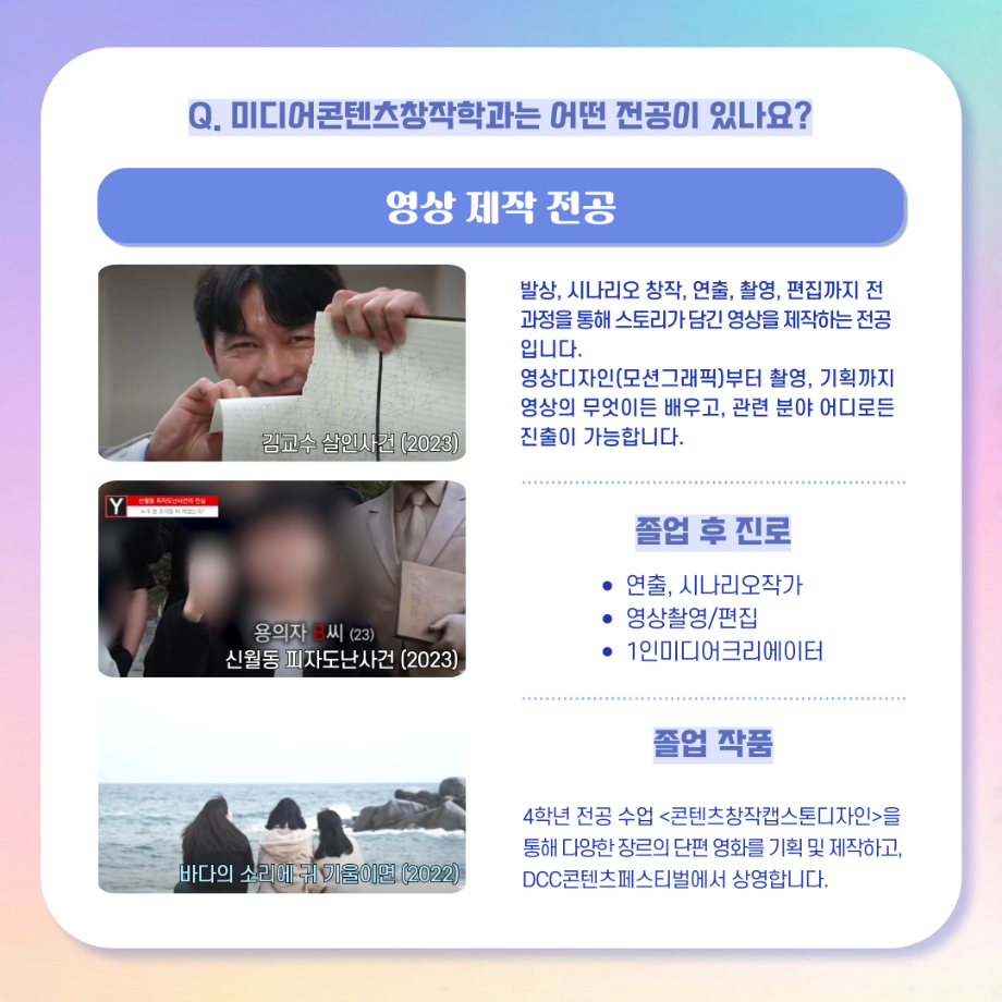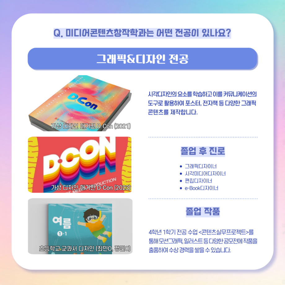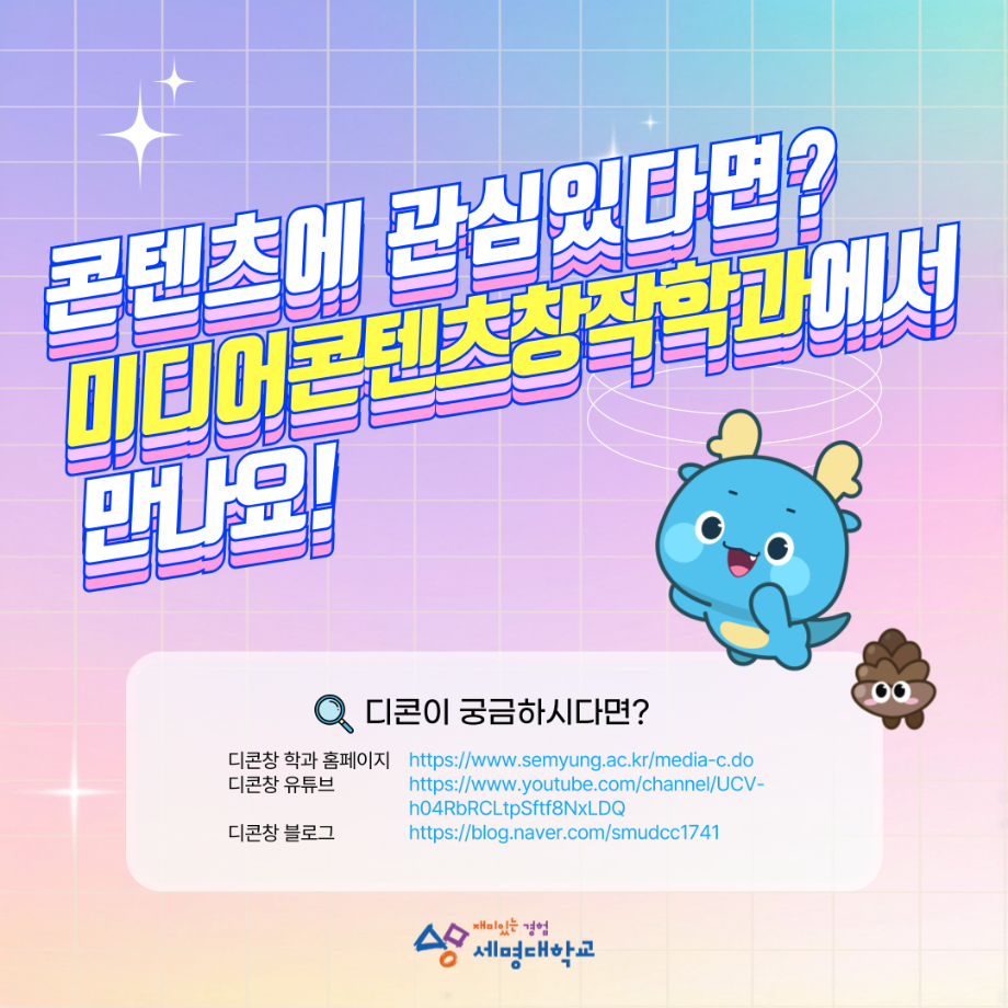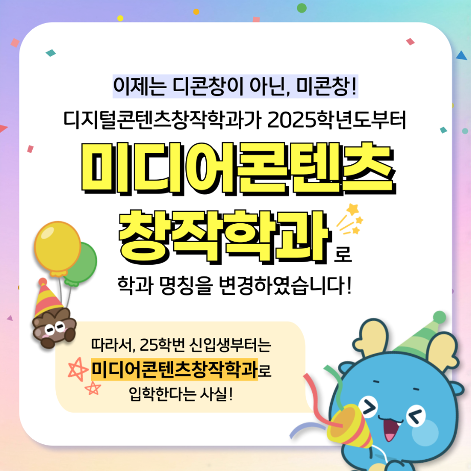 본문 시작 홈으로 MCC News 학과소개 교수소개 학과과정 MCC News MCC SNS 홈페이지가이드 학과 및 재학생 학과 및 재학생 교수 및 졸업생 미디어 정보통 학과 및 재학생 페이스북 트위터 프린트 디콘창, 미디어콘텐츠창작학과로 이름을 변경하다?! 미디어콘텐츠창작학과 2036 2024-09-12 디지털콘텐츠창작학과가 2025년도부터 학과명을 미디어콘텐츠창작학과로 변경하게 되었습니다! 기존 학과명보다 더욱 명확하게 방향성과 특성을 나타내게 되어 정말로 기쁩니다 목록 이전세명대학교에서 알려주는 입시 소식! 다음 2024년 추석맞이 특별 이벤트 담당부서 : 미디어콘텐츠창작학과 담당자 : - 연락처 : 043-649-1741 최종수정일 : 2024-10-26 만족도조사 만족도 조사 이 페이지에서 제공하는 정보에 대하여 만족하시나요? 매우만족 만족 보통 불만족 매우불만족