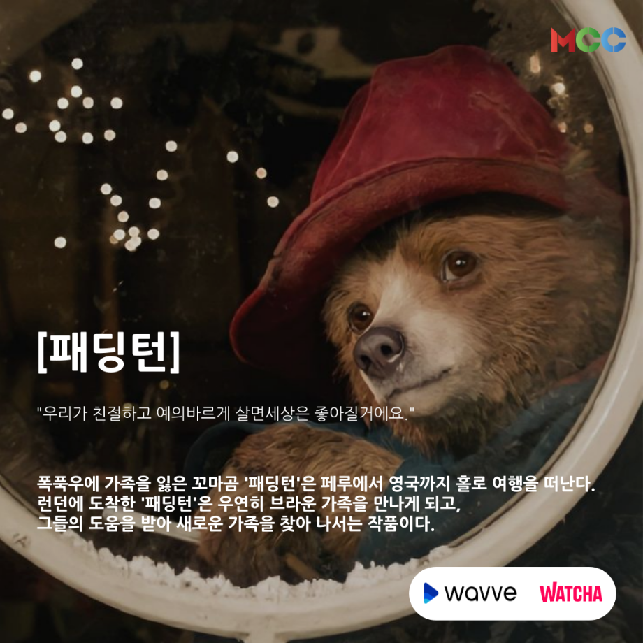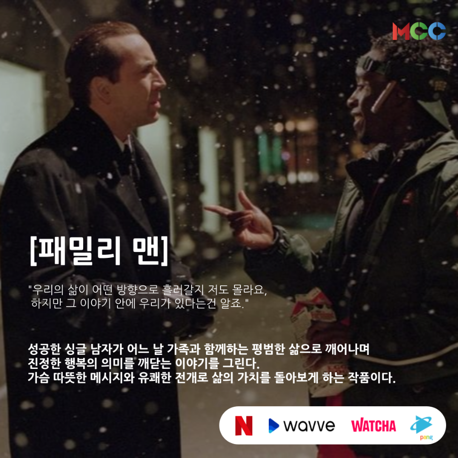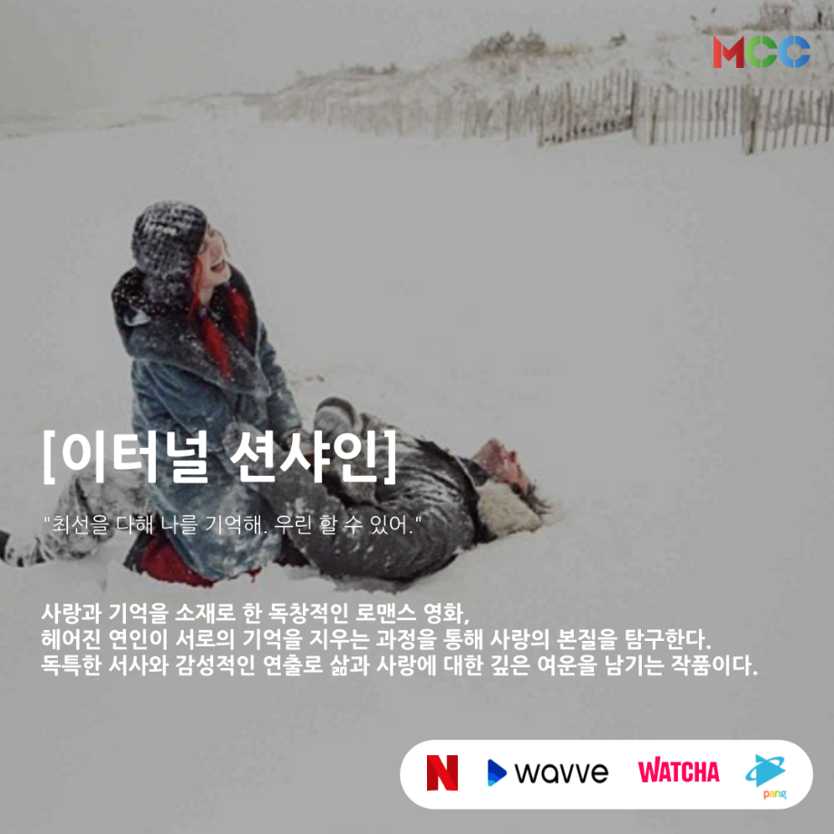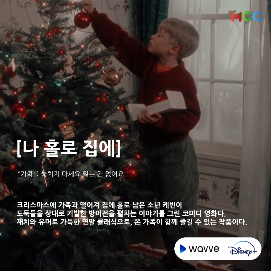 본문 시작 홈으로 MCC News 학과소개 교수소개 학과과정 MCC News MCC SNS 홈페이지가이드 학과 및 재학생 학과 및 재학생 교수 및 졸업생 미디어 정보통 학과 및 재학생 페이스북 트위터 프린트 "겨울 감성 가득! ❄ 추천 영화 6편" 미디어콘텐츠창작학과 2847 2025-01-22 춥고 포근한 계절, 마음까지 따뜻하게 해줄 영화들로 겨울을 더 특별하게 만들어보세요! ☃🎬 📽 1. 이터널 선샤인 📽 2. 패딩턴 📽 3. 패밀리 맨 📽 4. 노팅힐 📽 5. 맨체스터 바이 더 씨 📽 6. 나 홀로 집에 목록 이전학과잡지 <커뮤니케이션 통> 22호 발간! 다음 미콘창이라면 누구나! 필수 자격증 담당부서 : 미디어콘텐츠창작학과 담당자 : - 연락처 : 043-649-1741 최종수정일 : 2024-10-26 만족도조사 만족도 조사 이 페이지에서 제공하는 정보에 대하여 만족하시나요? 매우만족 만족 보통 불만족 매우불만족