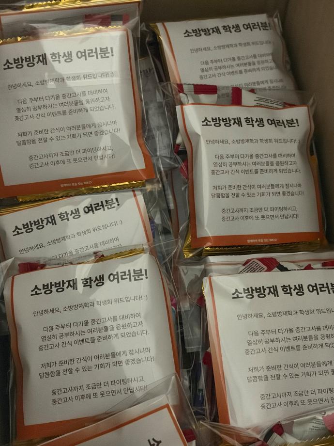 본문 시작 홈으로 커뮤니티 학과소개 교수소개 전공과정 커뮤니티 홈페이지가이드 학과행사 학과공지 채용정보 학사일정 학과행사 학생회 동아리 소방방재학과의 자랑 궁금합니다 수험생 Q&A 학과행사 페이스북 트위터 프린트 2026학년도 1학기 중간고사 간식 이벤트 소방방재학과 76 2026-04-14 2026년 4월 14일 화요일 안녕하세요, 세명대학교 소방방재학과 제21대 학생회 위드입니다! 공학관 209호 앞에서 17시 30분부터 18시까지 2026학년도 1학기 중간고사 간식 이벤트를 진행하였습니다! 수령하지 못하신 분들은 15일에 걸쳐 수령하실 수 있도록 도와드릴 예정입니다. 중간고사까지 다들 파이팅 하시고 좋은 결과 있으시길 바라겠습니다! 목록 이전캡스톤디자인 작품 중앙시장 번영회에 기증 담당부서 : 소방방재학과 담당자 : - 연락처 : 043-649-1787 최종수정일 : 2024-10-26 만족도조사 만족도 조사 이 페이지에서 제공하는 정보에 대하여 만족하시나요? 매우만족 만족 보통 불만족 매우불만족