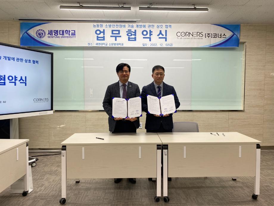 이날 (주) 코너스와 세명대학교 소방방재학과는 상호 간의 긴밀한 기술 업무 협약하고 이와 더불어 세명대학교 소방방재학과 학생들의 취업 연계를 진행하기로 하였습니다.