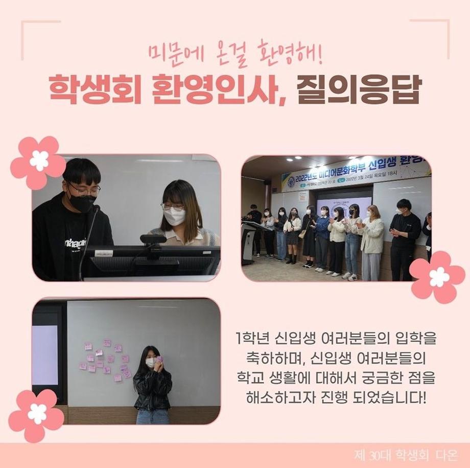 3월에는 미디어문화학부 신입생들을 위한 신입생환영회가 있었습니다! 미디어문화학부 1학년 신입생 여러분들의 입학을 축하하며, 신입생 여러분들의 학교 생활에 대해서 궁금한 점을 해소하고자 이번 신입생 환영회 자리를 준비했습니다.