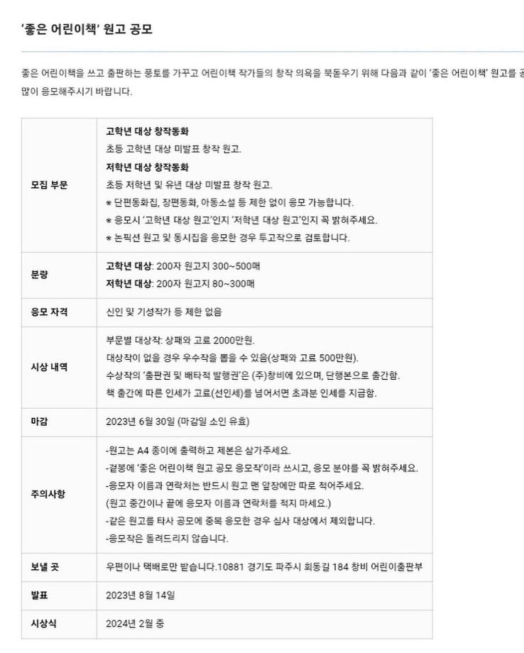 좋은 어린이책 원고 공모: (~ 2023/06/30)