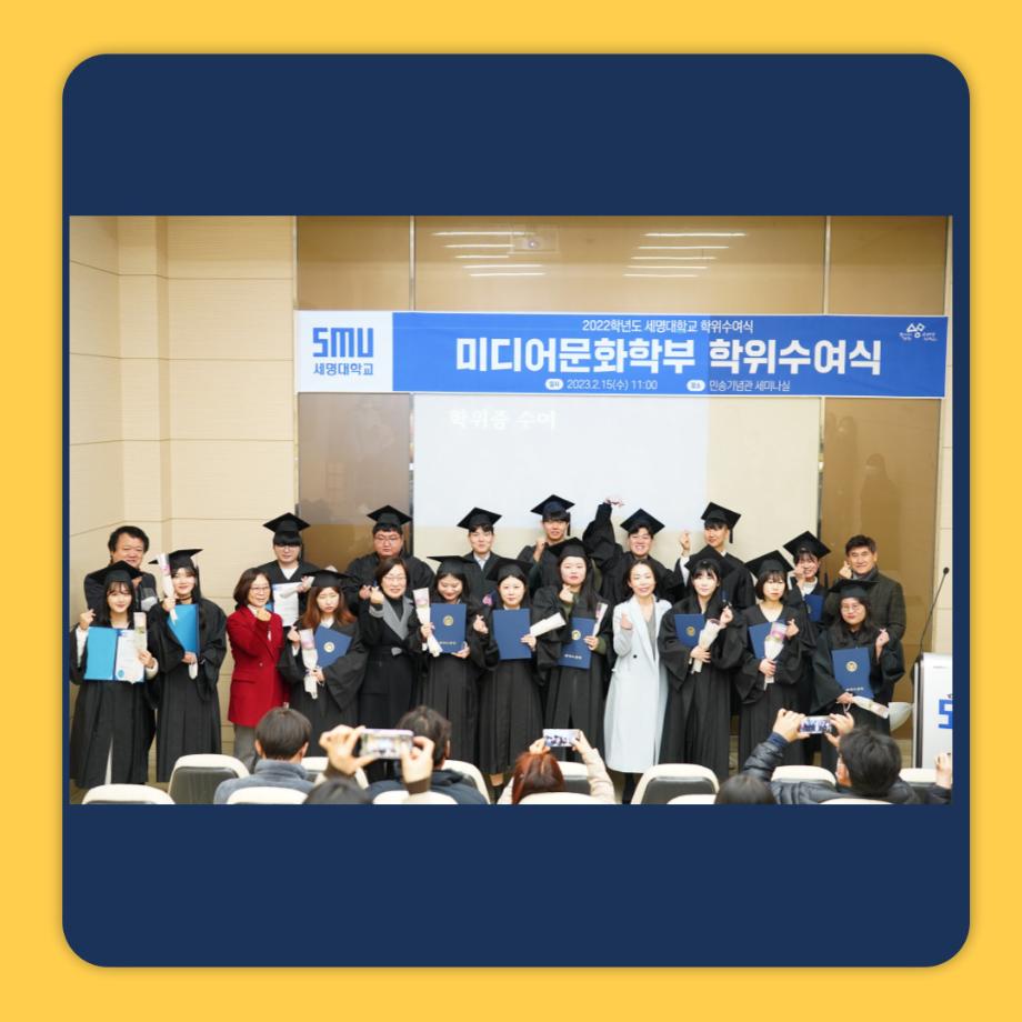 본문 시작 홈으로 학부소식 학부소개 교육과정 학부소식 커뮤니티 홈페이지가이드 학부행사 공지사항 학사일정 학부행사 미문뉴스 미문한컷 포토갤러리 학부행사 페이스북 트위터 프린트 [2월의 행사] 제29회 학위수여식 미디어문화학부 3185 2023-03-09 2023년 2월 15일, 2022학년도 미디어문화학부 학위수여식을 진행하였습니다. 선배님들의 학위수여식을 보니 저까지 아쉬운 마음이 들었습니다. 새로운 출발을 하시는 선배님들의 앞길이 항상 꽃길만 가득 차 있기를 저희 미디어 문화학부가 응원하겠습니다! 다시 한번 진심으로 졸업을 축하드립니다! 목록 이전미디어문화학부 학술제 어울림 '다시, 새롭게' 다음 [2월의 행사] 세명대학교 미디어문화학부 꿈설계학기 담당부서 : 미디어문화학부 담당자 : - 연락처 : 043-649-1760 최종수정일 : 2024-10-26 만족도조사 만족도 조사 이 페이지에서 제공하는 정보에 대하여 만족하시나요? 매우만족 만족 보통 불만족 매우불만족