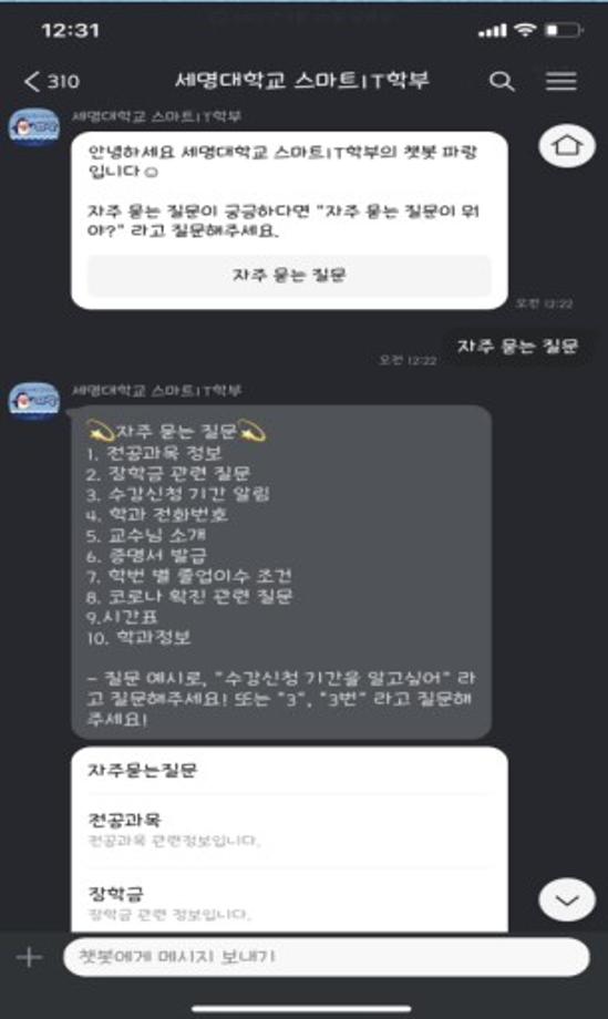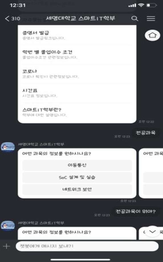 본문 시작 홈으로 SMIT 소식 SMIT 소개 SMIT 교육 SMIT 취업 SMIT 소식 SMIT 입학 홈페이지가이드 경진대회 공지사항 갤러리 경진대회 동아리 경진대회 페이스북 트위터 프린트 2022 캡스톤디자인 최우수상 스마트챗봇 스마트IT학부 8228 2022-06-02 최우수상 - 작품명 : 스마트챗봇 - 지도교수 : 송미화 - 팀원 : 김도연, 서황희, 황태현, 이영건 다수의 사용자들을 동시에 응대하는 다중처리성과 즉각 반응하는 실시간성 등 여러 장점을 갖춘 챗봇을 대다수의 학부생들이 이용하고 있고, 간단하게 접근 가능한 카카오톡에 연동시켜 개발하였다. 목록 이전2022 캡스톤디자인 우수상 Drone GCS Software 다음 멀티모달 기반 인공감성지능 모델 개발 담당부서 : 스마트IT학부 담당자 : - 연락처 : 043-649-1275 최종수정일 : 2024-10-26 만족도조사 만족도 조사 이 페이지에서 제공하는 정보에 대하여 만족하시나요? 매우만족 만족 보통 불만족 매우불만족