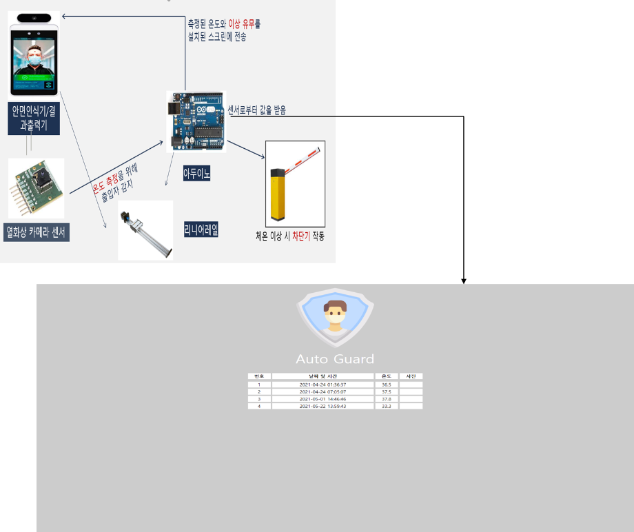 본문 시작 홈으로 SMIT 소식 SMIT 소개 SMIT 교육 SMIT 취업 SMIT 소식 SMIT 입학 홈페이지가이드 경진대회 공지사항 갤러리 경진대회 동아리 경진대회 페이스북 트위터 프린트 2021 캡스톤디자인 우수상 Arduino 기반 자동 높이 조절기능의 안면 체온 측정 장치 스마트IT학부 4624 2021-09-01 우수상 - 작품명 : Arduino 기반 자동 높이 조절기능의 안면 체온 측정 장치 - 지도교수 : 조면균 - 팀원 : 강진우, 정재범, 황원준, 이정환, 박세혁 코로나가 발병한 이후 실내에 출입할 때 체온 체크가 필수가 되었는데 고령자의 경우 거동이 불편하다 보니 얼굴을 체온계 높이에 맞추는 게 힘들다. 이에 Arduino 기반으로 높이를 자동으로 조정하고, 이상 체온의 경우 관리자에게 긴급하게 알린다. 목록 이전2021 캡스톤디자인 우수상 책 읽어드립니다 다음 2021 캡스톤디자인 우수상 Smart On Collar (S.O.C) 담당부서 : 스마트IT학부 담당자 : - 연락처 : 043-649-1275 최종수정일 : 2024-10-26 만족도조사 만족도 조사 이 페이지에서 제공하는 정보에 대하여 만족하시나요? 매우만족 만족 보통 불만족 매우불만족