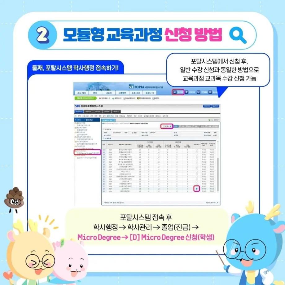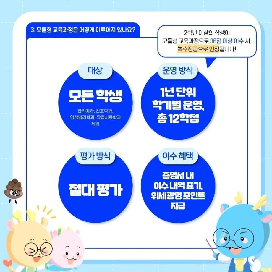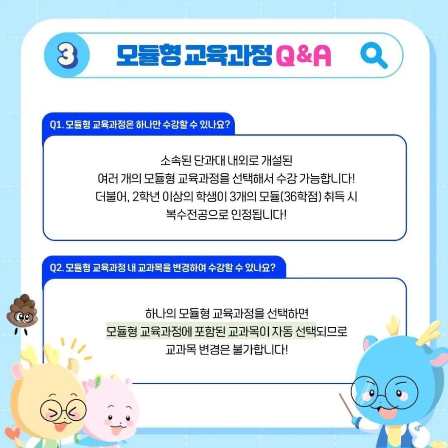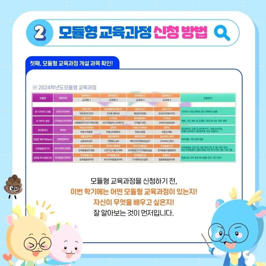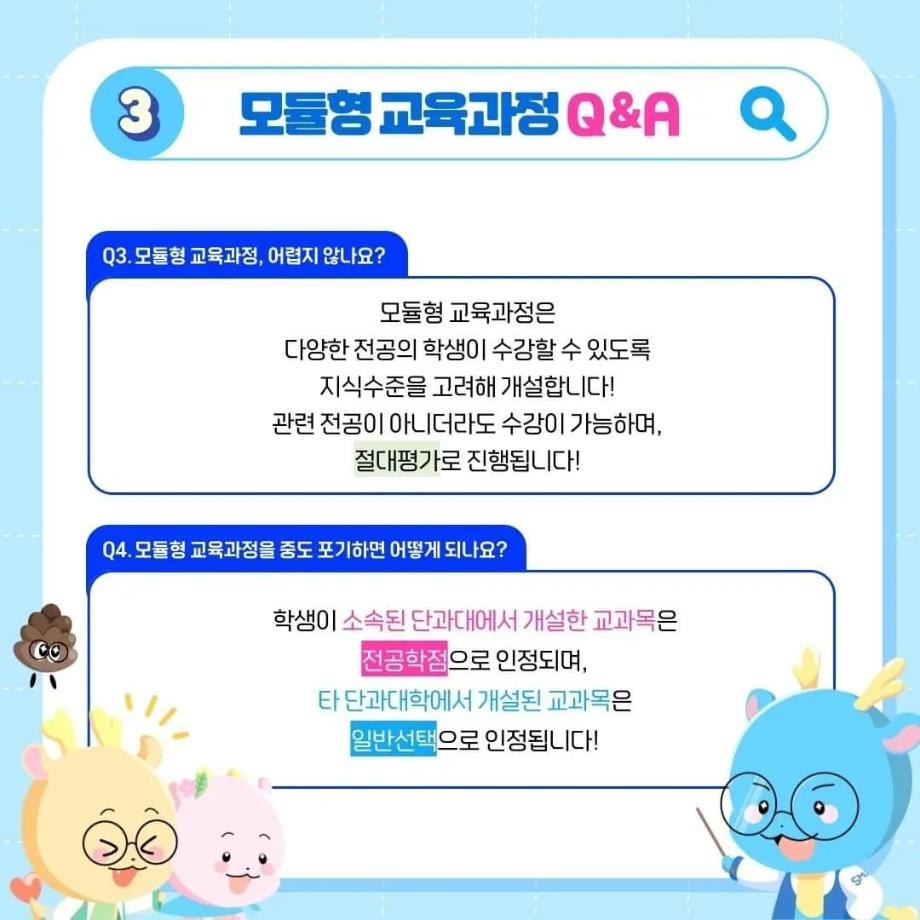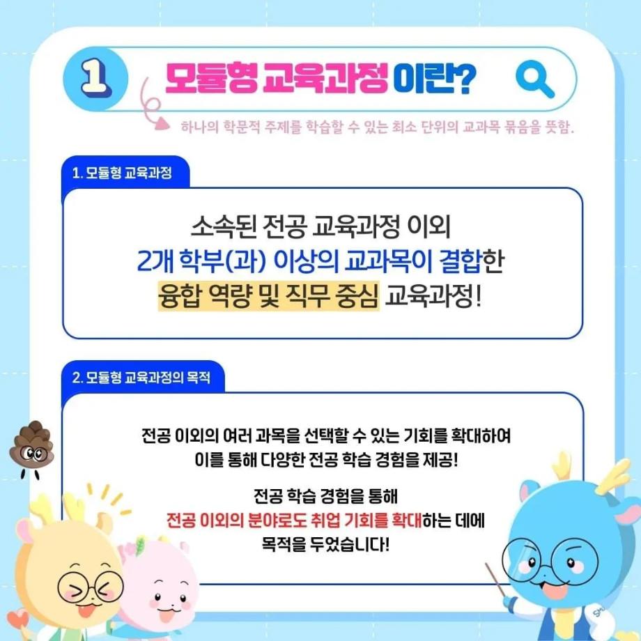 본문 시작 홈으로 SMIT 소식 SMIT 소개 SMIT 교육 SMIT 취업 SMIT 소식 SMIT 입학 홈페이지가이드 갤러리 공지사항 갤러리 경진대회 동아리 갤러리 페이스북 트위터 프린트 ✨모듈형 교육과정✨ 안내 스마트IT학부 2730 2024-03-29 융합인재를 위한 세명대의 새로운 시도, ✨모듈형 교육과정✨ 안내 2024년부터 시행되는 모듈형 교육과정! 2개 학부(과) 이상의 교과목이 결합한 ✔융합 역량 및 직무 중심 교육과정✔으로, 다양한 전공 학습 경험 제공을 통해 전공 이외의 분야로 ✨취업 기회를 확대✨할 수 있습니다! 모듈형 교육과정이 더 궁금하다면? 📞 043) 649-1131, 1135 (세명대학교 교무연구처 학사관리팀) 목록 이전2024학년도 신입생 환영회😀 다음 제천시 전입 장학금 안내 ! 담당부서 : 스마트IT학부 담당자 : - 연락처 : 043-649-1275 최종수정일 : 2024-10-26 만족도조사 만족도 조사 이 페이지에서 제공하는 정보에 대하여 만족하시나요? 매우만족 만족 보통 불만족 매우불만족