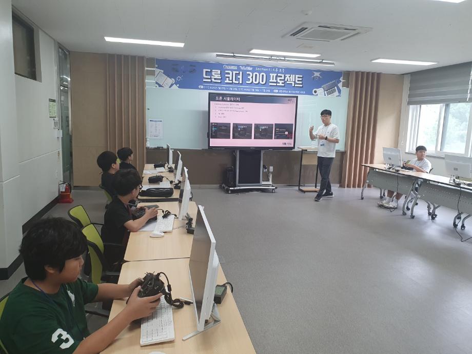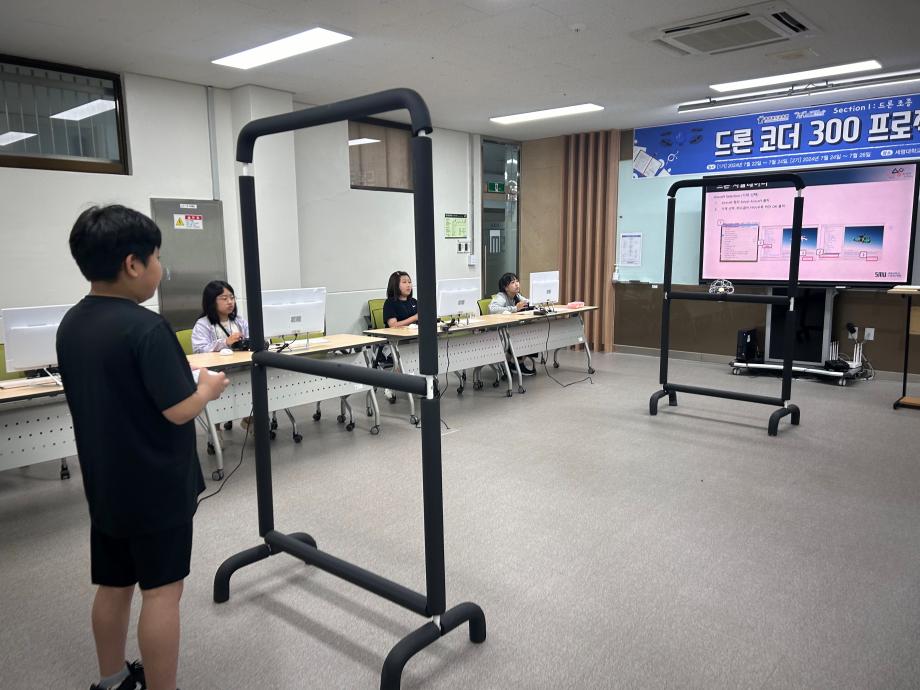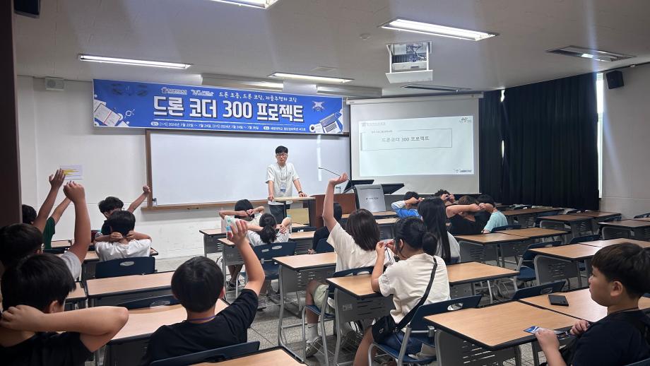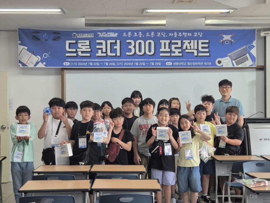 세명대학교 스마트IT학부는 2024년 7월 22일부터 충북교육청의 사업 지원을 받아 ‘드론코더300 프로젝트’ 방학프로그램을 진행하였다. 교육 대상자는 제천, 충주, 단양지역 초등학교 5학년 학생들이었으며, 7월 22일부터 24일까지 1기 20명, 7월 24일부터 26일까지 2기 22명, 총 42명의 학생이 선정되어 교육에 참여하였다. 교육은 숙박형 캠프 형식으로 진행되었으며 세명대학교의 기숙사와 학생식당, 스마트IT학부의 시설을 활용하여 진행되었다.