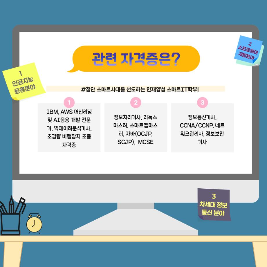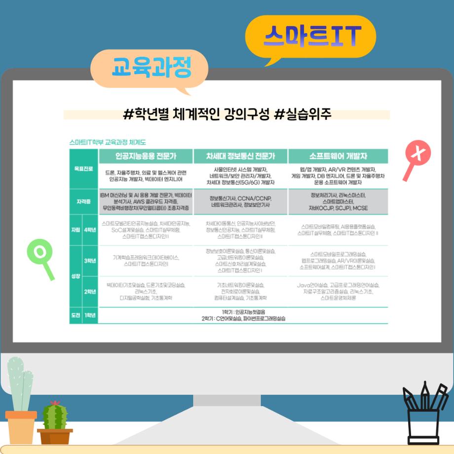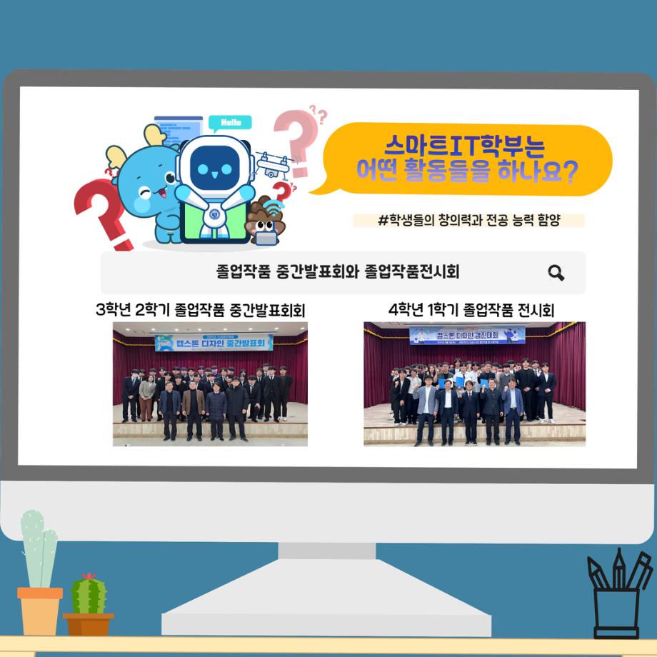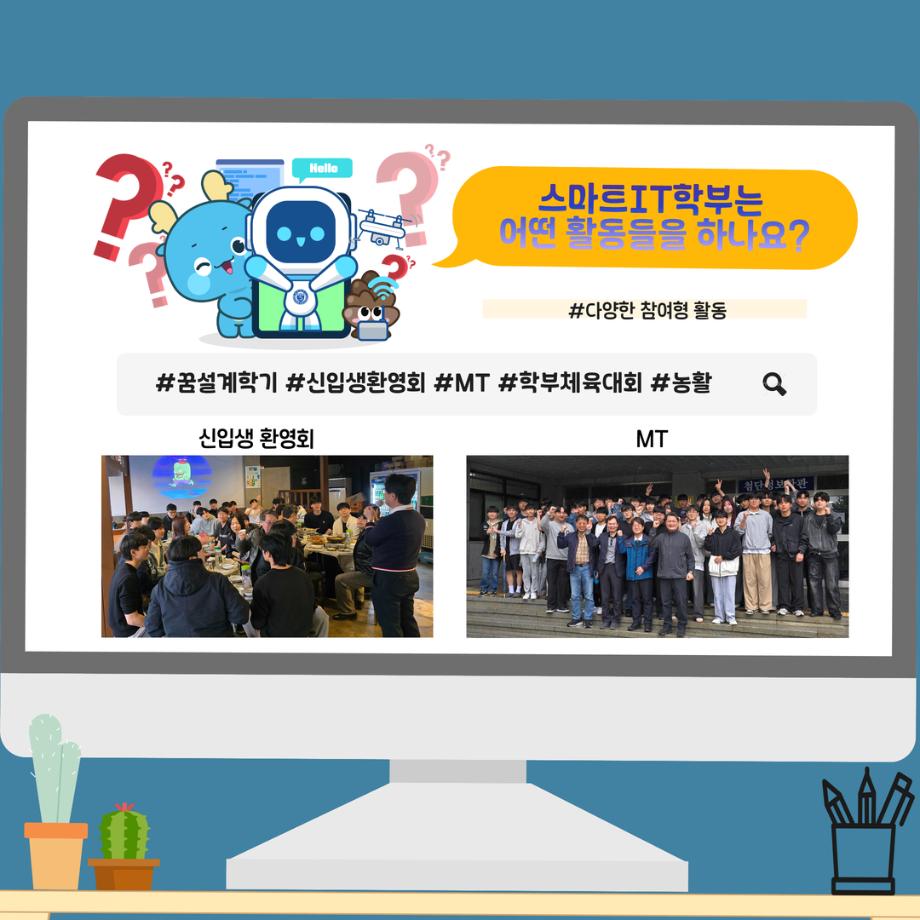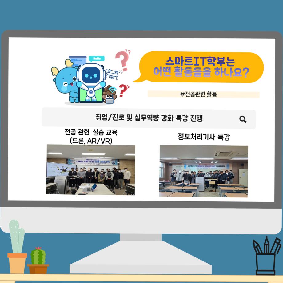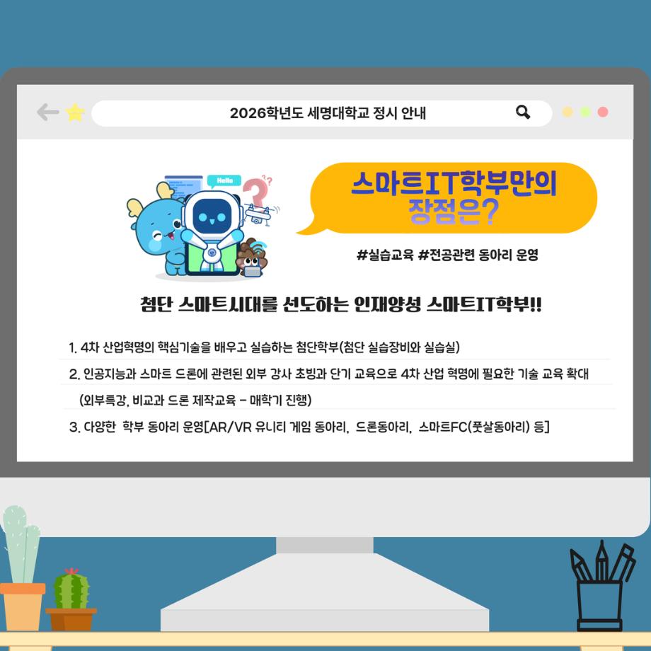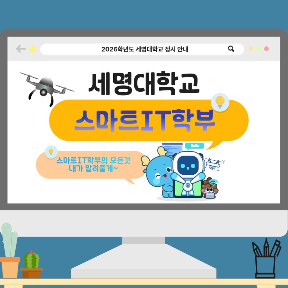 본문 시작 홈으로 SMIT 소식 SMIT 소개 SMIT 교육 SMIT 취업 SMIT 소식 SMIT 입학 홈페이지가이드 갤러리 공지사항 갤러리 경진대회 동아리 갤러리 페이스북 트위터 프린트 📢2026 정시모집 + 스마트IT학부의 각종활동📢 스마트IT학부 894 2025-12-30 📢2026 정시모집 + 스마트IT학부의 각종활동📢 목록 이전2026 정시모집 안내 다음 (축) 신규 임용 신용제 교수 담당부서 : 스마트IT학부 담당자 : - 연락처 : 043-649-1275 최종수정일 : 2024-10-26 만족도조사 만족도 조사 이 페이지에서 제공하는 정보에 대하여 만족하시나요? 매우만족 만족 보통 불만족 매우불만족