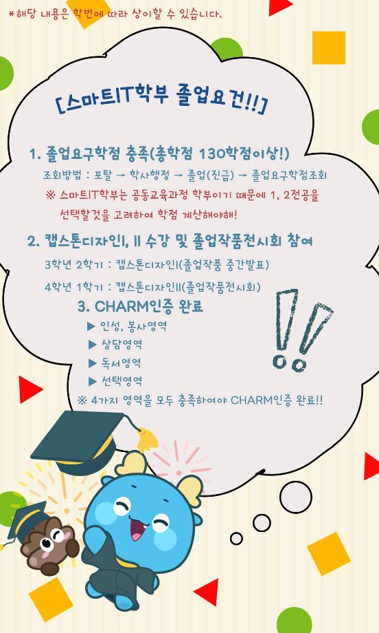 본문 시작 홈으로 SMIT 소식 SMIT 소개 SMIT 교육 SMIT 취업 SMIT 소식 SMIT 입학 홈페이지가이드 갤러리 공지사항 갤러리 경진대회 동아리 갤러리 페이스북 트위터 프린트 스마트IT알림_4월 : 스마트IT학부 졸업요건 스마트IT학부 35 2026-04-14 스마트IT알림_4월 : 스마트IT학부 졸업요건 목록 이전세명대알림_4월(2) : 세명대학교 벚꽃 담당부서 : 스마트IT학부 담당자 : - 연락처 : 043-649-1275 최종수정일 : 2024-10-26 만족도조사 만족도 조사 이 페이지에서 제공하는 정보에 대하여 만족하시나요? 매우만족 만족 보통 불만족 매우불만족