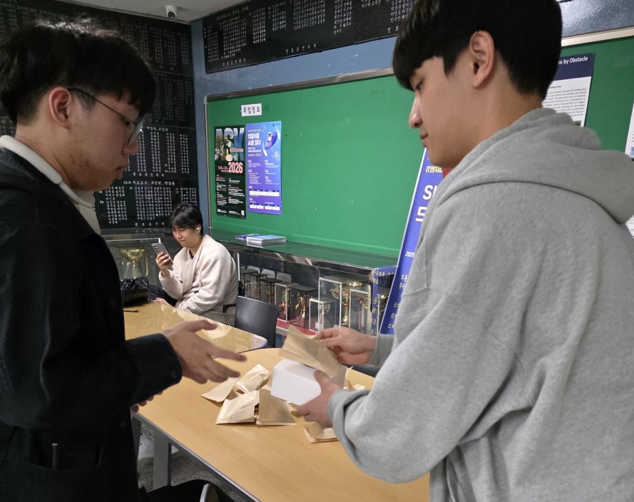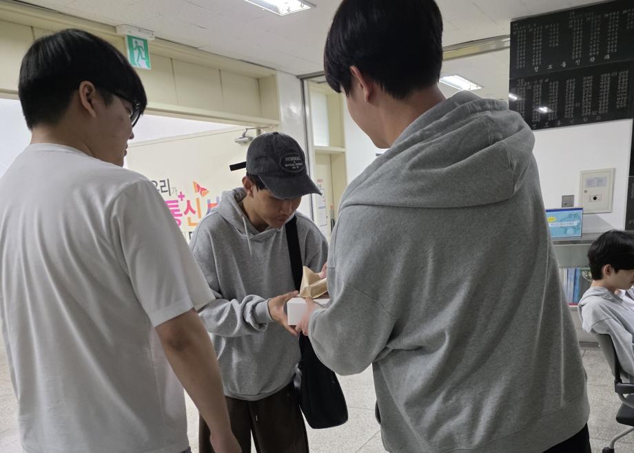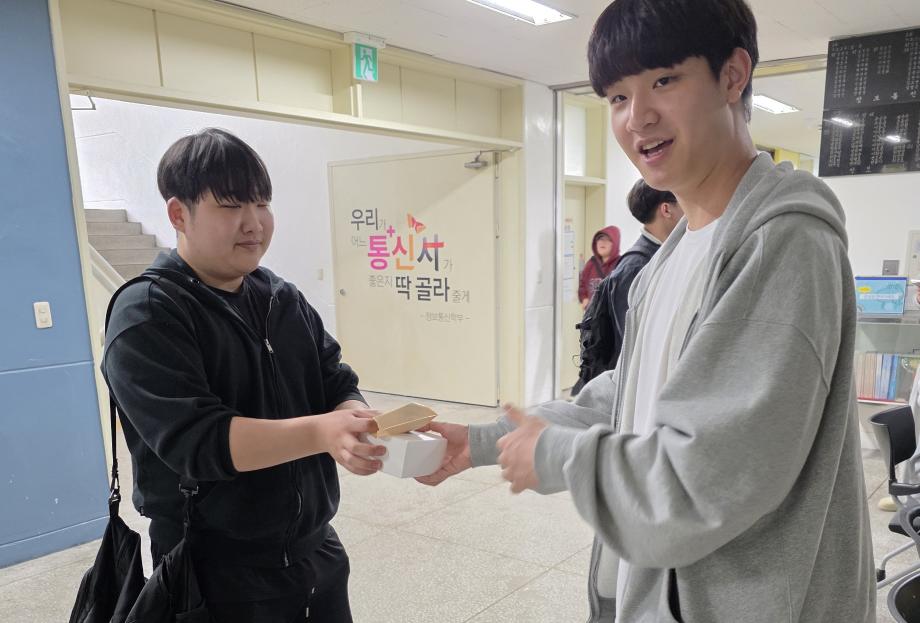 본문 시작 홈으로 SMIT 소식 SMIT 소개 SMIT 교육 SMIT 취업 SMIT 소식 SMIT 입학 홈페이지가이드 갤러리 공지사항 갤러리 경진대회 동아리 갤러리 페이스북 트위터 프린트 2026학년도 스마트IT학부 중간고사 간식나눔 이벤트👊 스마트IT학부 7 2026-04-20 안녕하세요 세명대학교 스마트IT학부입니다😀 2026년 4월 20일 신입생들을 위해 중간고사 응원 간식 나눔 행사를 진행하였습니다. 작은 선물이지만 열심히 준비한 만큼 맛있게 드셔주셔서 감사드리며, 머지않은 중간고사, 학우분들 화이팅하시고 노력한만큼 좋은 결과로 보답받으시길 응원합니다👊 목록 이전스마트IT알림_4월 : 스마트IT학부 졸업요건 담당부서 : 스마트IT학부 담당자 : - 연락처 : 043-649-1275 최종수정일 : 2024-10-26 만족도조사 만족도 조사 이 페이지에서 제공하는 정보에 대하여 만족하시나요? 매우만족 만족 보통 불만족 매우불만족