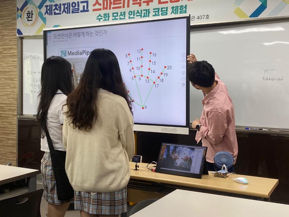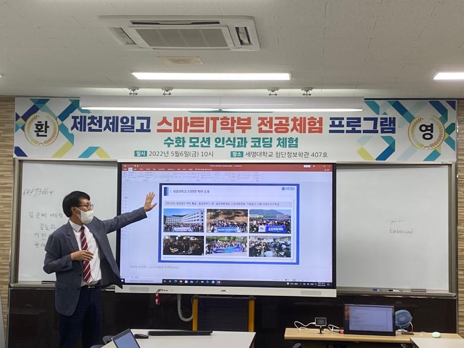 스마트IT학부는 2022.05.06 (금) 오전10시부터 오전 11시 30분 까지 첨단정보학관 407호에서 제천제일고 3학년 재학생을 대상으로 전공체험 프로그램을 시행하였다.