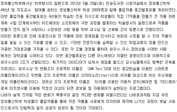 본문 시작 홈으로 SMIT 소식 SMIT 소개 SMIT 교육 SMIT 취업 SMIT 소식 SMIT 입학 홈페이지가이드 갤러리 공지사항 갤러리 경진대회 동아리 갤러리 페이스북 트위터 프린트 정보통신학부 졸업작품전 개최 오선진 7005 2012-10-04 일시 : 2012년 9월 18일 장소 : 제천 시민회관 2층 전시실 목록 이전2012학년도 졸업작품 중간발표회 개최 다음 2012년도 정보통신학부 연합 MT 담당부서 : 스마트IT학부 담당자 : - 연락처 : 043-649-1275 최종수정일 : 2024-10-26 만족도조사 만족도 조사 이 페이지에서 제공하는 정보에 대하여 만족하시나요? 매우만족 만족 보통 불만족 매우불만족