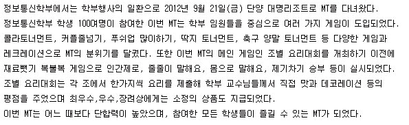 본문 시작 홈으로 SMIT 소식 SMIT 소개 SMIT 교육 SMIT 취업 SMIT 소식 SMIT 입학 홈페이지가이드 갤러리 공지사항 갤러리 경진대회 동아리 갤러리 페이스북 트위터 프린트 기업체험과 ACE 프로그램 일환 KT 견학 오선진 7399 2012-11-04 일시 : 2012년 10월 26일(금) 09:30 -18:00대상 : 정보통신학부 3,4학년 (70명)인솔 : 오선진 학부장, 이성재 교수출발장소 : 전산정보학관 앞 목록 이전2012년도 정보통신학부 연합 MT 다음 미드필더인증제 봉사활동 실시 담당부서 : 스마트IT학부 담당자 : - 연락처 : 043-649-1275 최종수정일 : 2024-10-26 만족도조사 만족도 조사 이 페이지에서 제공하는 정보에 대하여 만족하시나요? 매우만족 만족 보통 불만족 매우불만족