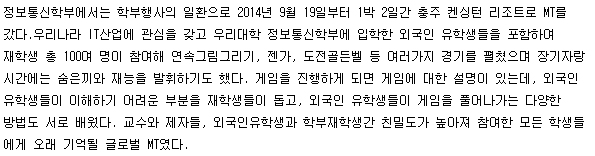본문 시작 홈으로 SMIT 소식 SMIT 소개 SMIT 교육 SMIT 취업 SMIT 소식 SMIT 입학 홈페이지가이드 갤러리 공지사항 갤러리 경진대회 동아리 갤러리 페이스북 트위터 프린트 정보통신학부 졸업작품 전시회 및 학부 특성화 사업 설명회 개최 오선진 8077 2014-10-07 정보통신학부 졸업작품 전시회 및 학부 특성화 사업 설명회 개최 목록 이전정보통신학부, 글로벌 MT 개최 다음 한방·의료 ICT 융합 인재 양성 사업단, 오송 국제 바이오 엑스포 견학 담당부서 : 스마트IT학부 담당자 : - 연락처 : 043-649-1275 최종수정일 : 2024-10-26 만족도조사 만족도 조사 이 페이지에서 제공하는 정보에 대하여 만족하시나요? 매우만족 만족 보통 불만족 매우불만족