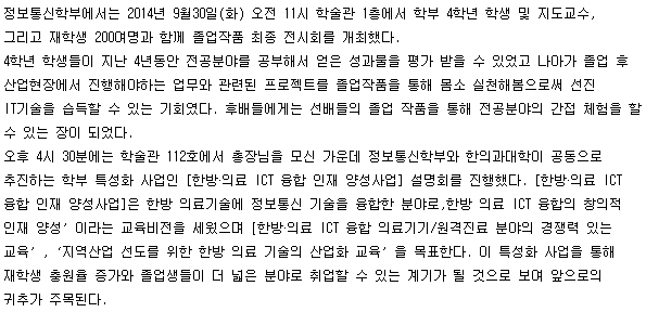 본문 시작 홈으로 SMIT 소식 SMIT 소개 SMIT 교육 SMIT 취업 SMIT 소식 SMIT 입학 홈페이지가이드 갤러리 공지사항 갤러리 경진대회 동아리 갤러리 페이스북 트위터 프린트 한방·의료 ICT 융합 인재 양성 사업단, 오송 국제 바이오 엑스포 견학 오선진 6924 2014-11-06 한방·의료 ICT 융합 인재 양성 사업단, 오송 국제 바이오 엑스포 견학 목록 이전정보통신학부 졸업작품 전시회 및 학부 특성화 사업 설명회 개최 다음 정보통신학부, 취업 전략을 위한 졸업생 특강 개최 담당부서 : 스마트IT학부 담당자 : - 연락처 : 043-649-1275 최종수정일 : 2024-10-26 만족도조사 만족도 조사 이 페이지에서 제공하는 정보에 대하여 만족하시나요? 매우만족 만족 보통 불만족 매우불만족