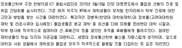 본문 시작 홈으로 SMIT 소식 SMIT 소개 SMIT 교육 SMIT 취업 SMIT 소식 SMIT 입학 홈페이지가이드 갤러리 공지사항 갤러리 경진대회 동아리 갤러리 페이스북 트위터 프린트 정보통신학부, "글로벌 정통 MT" 개최 관리자 6388 2015-09-30 정보통신학부, "글로벌 정통 MT" 개최 목록 이전한방-의료ICT 융합사업단, 졸업생 진로 및 취업간담회 실시 다음 한방-의료ICT 융합사업단, 캡스톤 디자인 경진대회 실시 담당부서 : 스마트IT학부 담당자 : - 연락처 : 043-649-1275 최종수정일 : 2024-10-26 만족도조사 만족도 조사 이 페이지에서 제공하는 정보에 대하여 만족하시나요? 매우만족 만족 보통 불만족 매우불만족