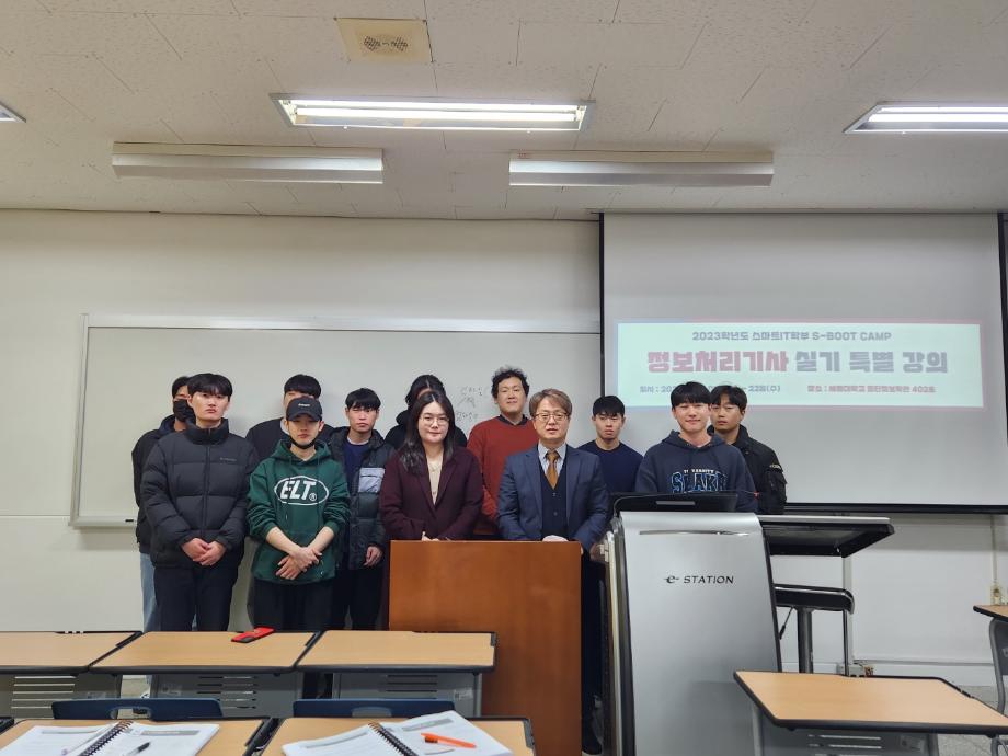 본문 시작 홈으로 SMIT 소식 SMIT 소개 SMIT 교육 SMIT 취업 SMIT 소식 SMIT 입학 홈페이지가이드 갤러리 공지사항 갤러리 경진대회 동아리 갤러리 페이스북 트위터 프린트 S-Boot Camp 정보처리기사 실기 특강 스마트IT학부 3844 2023-11-29 스마트IT학부는 4학년 재학생들을 대상으로 첨단정보학관 402호에서 2023.11.01(수), 08(수), 15(수), 22(수) 총 4주 동안 S-Boot Camp 정보처리기사 실기 특강을 시행했습니다. S-Boot Camp 정보처리기 실기 특강으로 학생들의 직무 역량을 강화할 수 있는 유익한 시간이었습니다. 목록 이전📌 잊지 말고! 수시 최초합격자 등록하자!! 다음 📌 2024학년도 세명대 정시 모집요강 안내 📌 담당부서 : 스마트IT학부 담당자 : - 연락처 : 043-649-1275 최종수정일 : 2024-10-26 만족도조사 만족도 조사 이 페이지에서 제공하는 정보에 대하여 만족하시나요? 매우만족 만족 보통 불만족 매우불만족