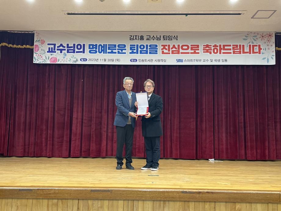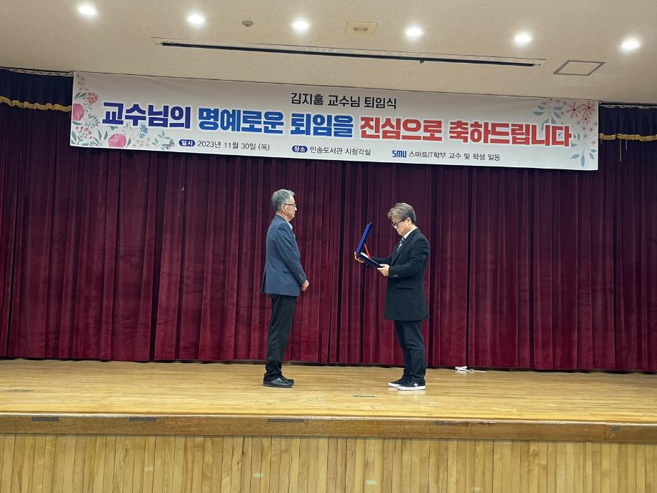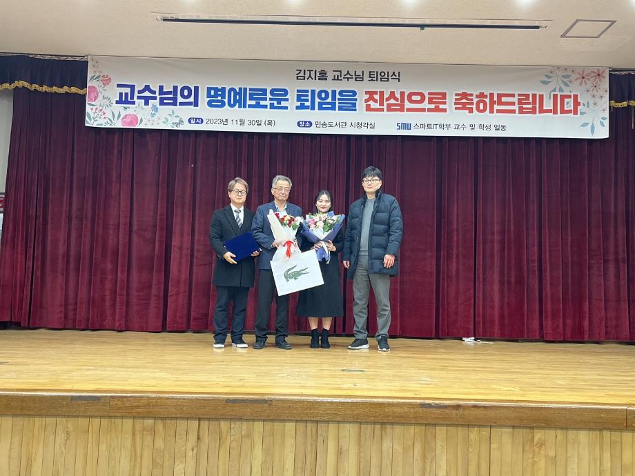 본문 시작 홈으로 SMIT 소식 SMIT 소개 SMIT 교육 SMIT 취업 SMIT 소식 SMIT 입학 홈페이지가이드 갤러리 공지사항 갤러리 경진대회 동아리 갤러리 페이스북 트위터 프린트 김지홍 교수님 퇴임식 진행 스마트IT학부 4050 2023-12-04 2023.11.30(목)에 스마트IT학부 김지홍 교수님의 명예로운 퇴임식이 시행 되었다. 본 행사는 <캡스톤 디자인 중간 발표회> 행사가 끝난 후 진행 되었다. 학생들의 영상편지와 재직 기념패 증정 및 꽃다발 증정으로 이루어졌다. 김지홍 교수님의 퇴임사와 권혁민 교수님의 축하 인사말이 있었다. 스마트IT학부 재학생들과 교수님들은 진심으로 김지홍 교수님의 명예로운 퇴임을 축하 하였다. 목록 이전스마트IT학부 캡스톤디자인 중간발표회 시행 다음 2023학년도 총장표창 수상 ! 담당부서 : 스마트IT학부 담당자 : - 연락처 : 043-649-1275 최종수정일 : 2024-10-26 만족도조사 만족도 조사 이 페이지에서 제공하는 정보에 대하여 만족하시나요? 매우만족 만족 보통 불만족 매우불만족