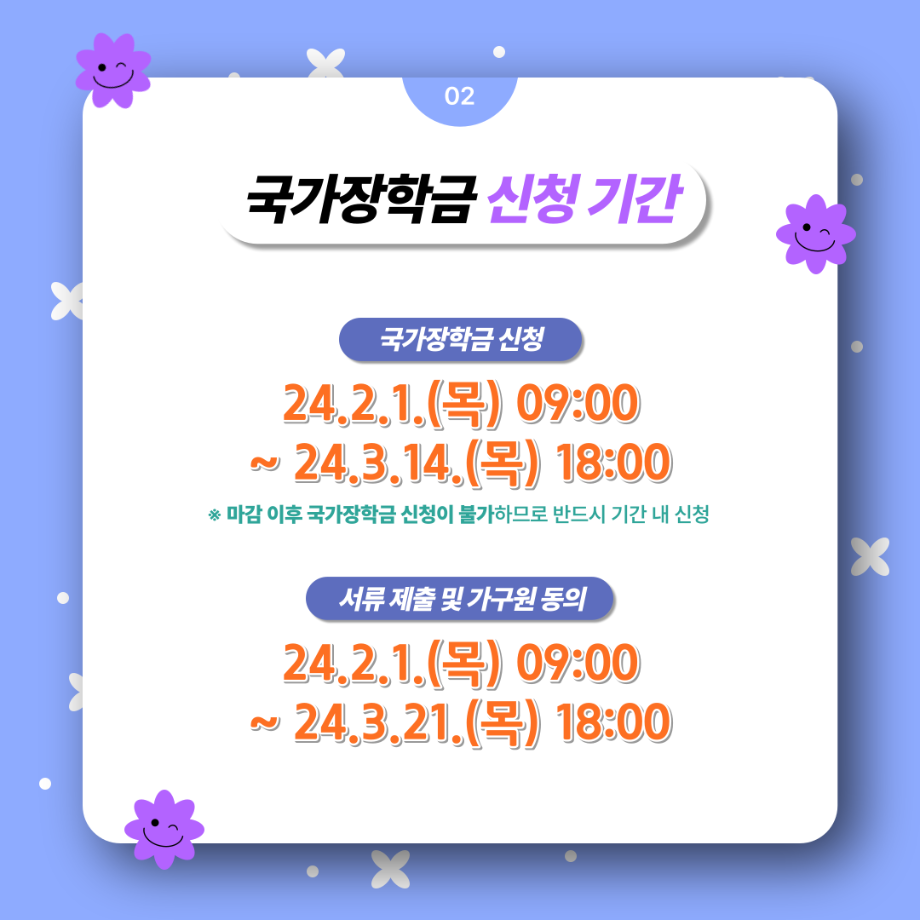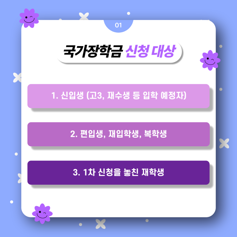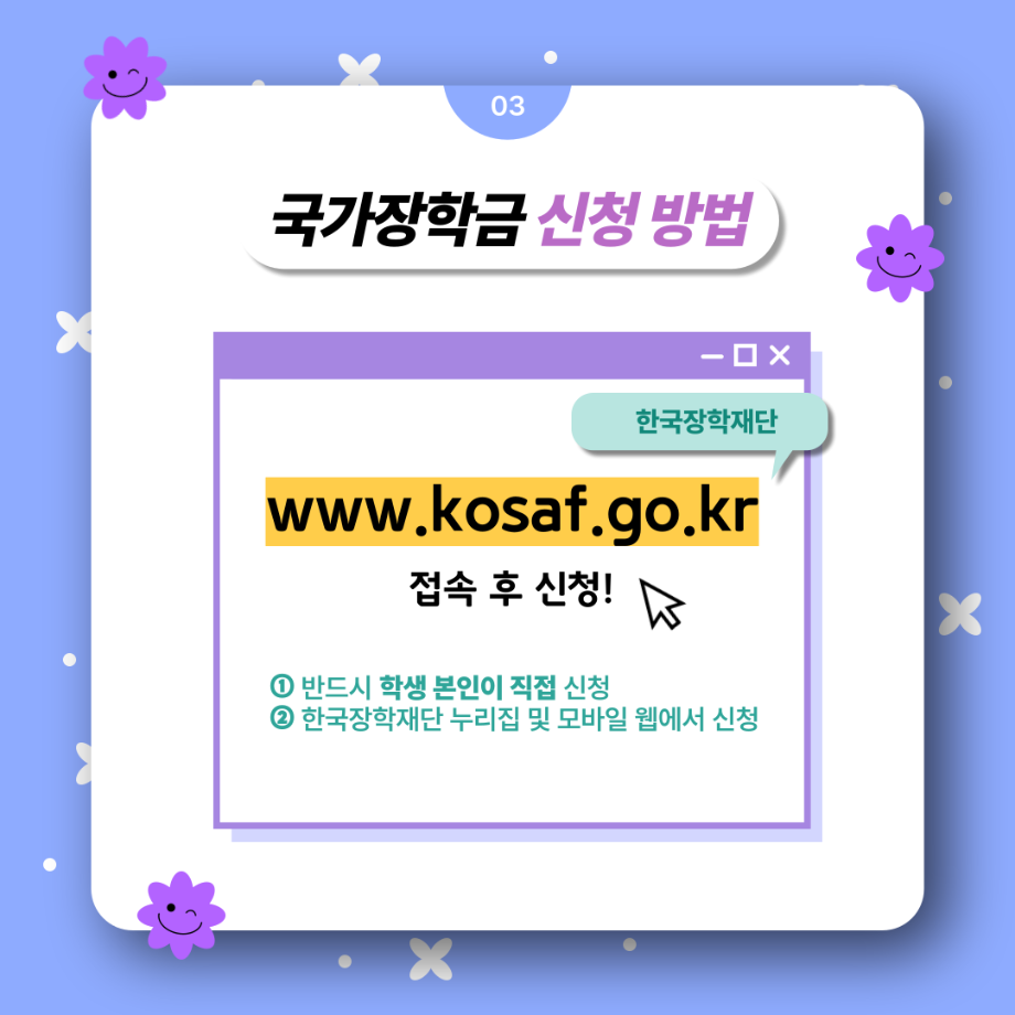 본문 시작 홈으로 SMIT 소식 SMIT 소개 SMIT 교육 SMIT 취업 SMIT 소식 SMIT 입학 홈페이지가이드 갤러리 공지사항 갤러리 경진대회 동아리 갤러리 페이스북 트위터 프린트 여러분! 국가장학금 2차 신청하세요! 스마트IT학부 2732 2024-02-23 여러분! 국가장학금 2차 신청하세요! ✔ 내가 세명대학교 신입생이라면! ✔ 내가 편입생, 재입학생, 복학생이라면! ✔ 내가 1차 신청을 놓쳤다면! 📌 24년 2월 1일(목) 09:00부터 3월 24일(목) 18:00까지 ✨ 한국장학재단 사이트에서 신청하세요! 목록 이전2024년도 꿈설계학기 2일차 다음 2024학년도 추가모집 주요사항 담당부서 : 스마트IT학부 담당자 : - 연락처 : 043-649-1275 최종수정일 : 2024-10-26 만족도조사 만족도 조사 이 페이지에서 제공하는 정보에 대하여 만족하시나요? 매우만족 만족 보통 불만족 매우불만족