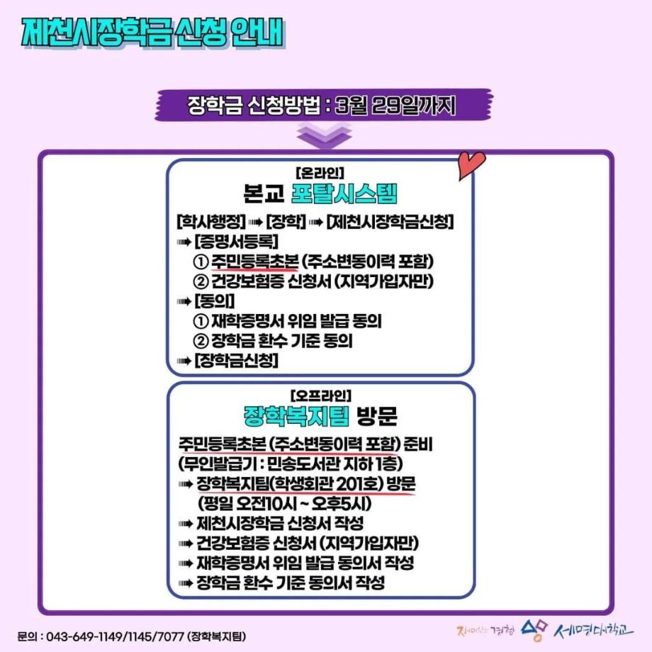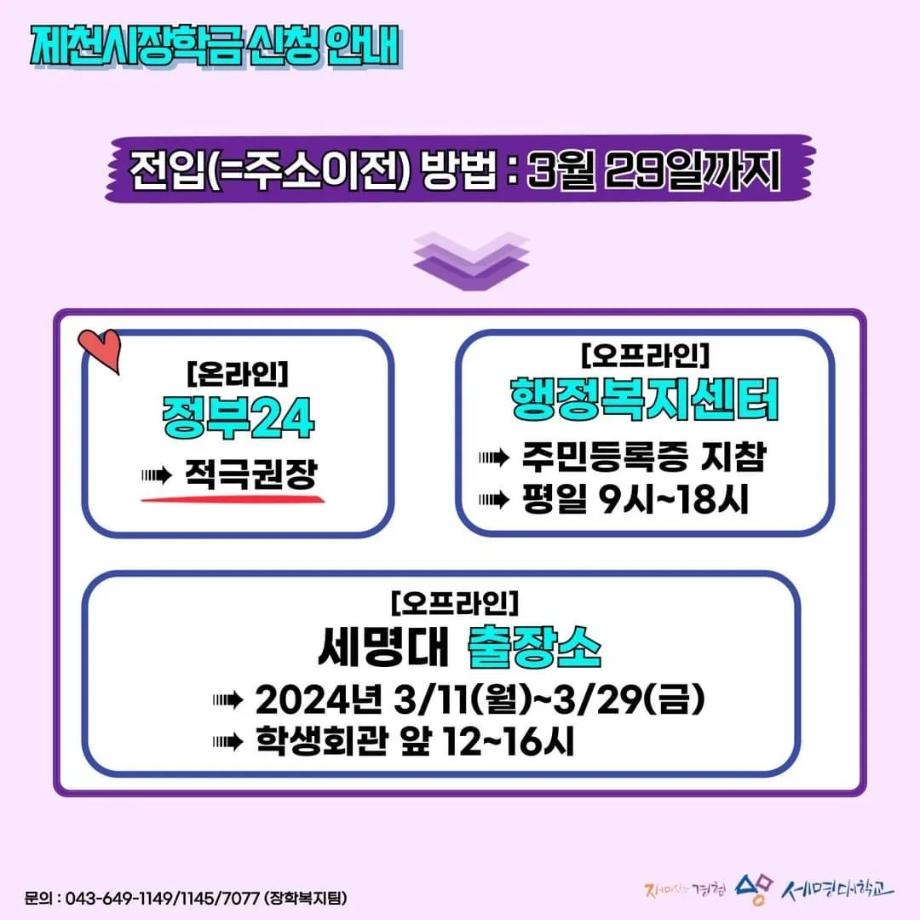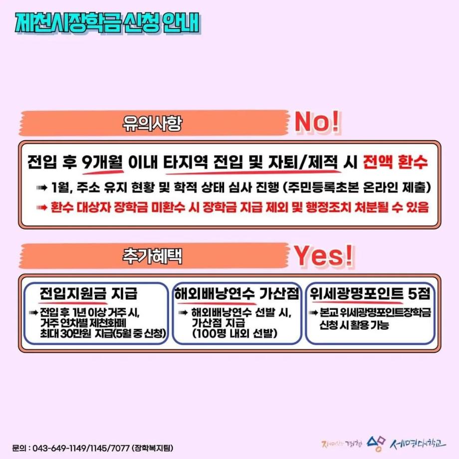 본문 시작 홈으로 SMIT 소식 SMIT 소개 SMIT 교육 SMIT 취업 SMIT 소식 SMIT 입학 홈페이지가이드 갤러리 공지사항 갤러리 경진대회 동아리 갤러리 페이스북 트위터 프린트 제천시 전입 장학금 안내 ! 스마트IT학부 2650 2024-03-29 ⏲ 신청기간 : 3월 29일(금) 까지 제천시로 전입하면 100만원을 드려요~ 목록 이전✨모듈형 교육과정✨ 안내 다음 엉뚱한 연구활동 프로그램 시행안내! 담당부서 : 스마트IT학부 담당자 : - 연락처 : 043-649-1275 최종수정일 : 2024-10-26 만족도조사 만족도 조사 이 페이지에서 제공하는 정보에 대하여 만족하시나요? 매우만족 만족 보통 불만족 매우불만족
