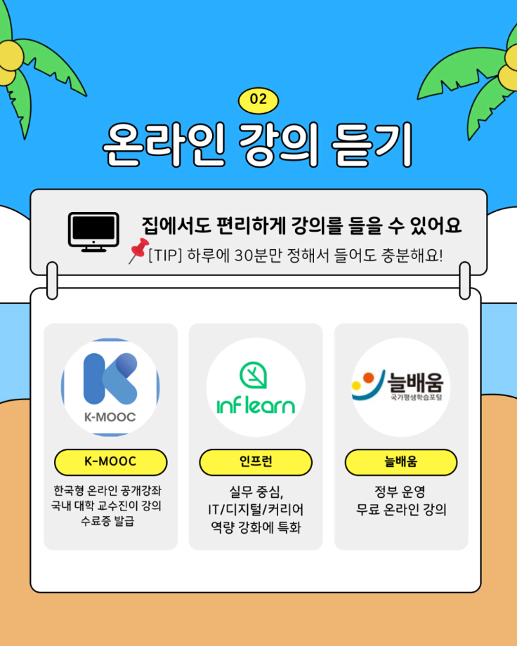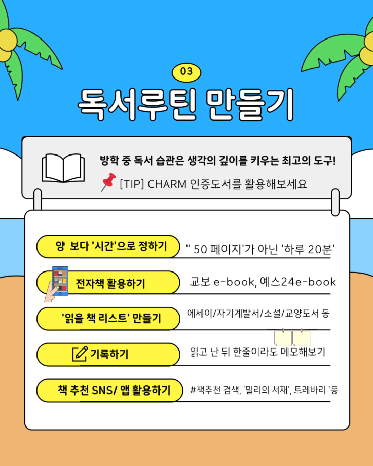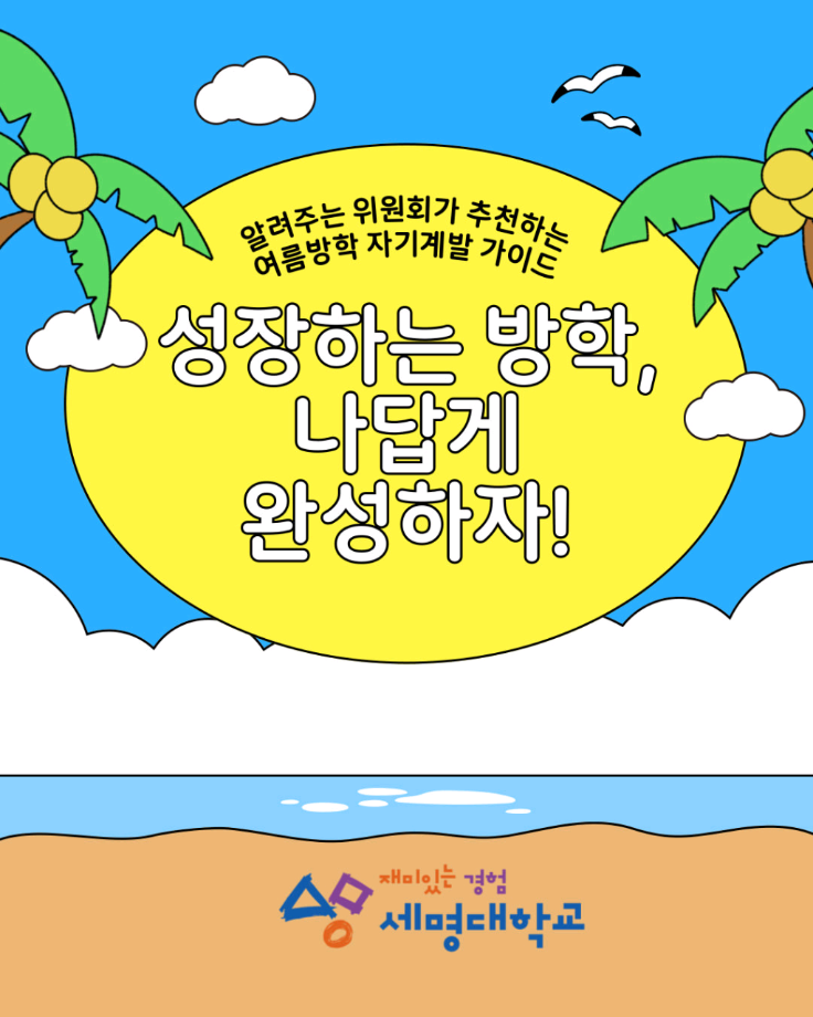 본문 시작 홈으로 SMIT 소식 SMIT 소개 SMIT 교육 SMIT 취업 SMIT 소식 SMIT 입학 홈페이지가이드 갤러리 공지사항 갤러리 경진대회 동아리 갤러리 페이스북 트위터 프린트 🌞여름방학 자기계발 가이드🏖️ 스마트IT학부 1581 2025-07-11 알려주는 위원회가 추천하는 🌞여름방학 자기계발 가이드🏖️ 📢 이번 방학, 그냥 흘려보낼 순 없죠! 자격증, 봉사, 독서까지 🌿 나만의 방식으로 성장하는 여름방학 시작해봐요! 알려주는 위원회가 추천하는 자기계발 꿀팁, 카드뉴스로 확인해보세요! ☀️ 출처 : 세명대학교 인스타그램 #세명대 #세명대학교 #대학 #방학자기계발 #성장하는방학 #자격증준비 #무료강의 #독서루틴 #봉사활동 #여름방학 #여름 목록 이전스마트IT학부 기말고사 간식나눔 이벤트👊 다음 CHARM인증제를 알려줘!⭐️ 담당부서 : 스마트IT학부 담당자 : - 연락처 : 043-649-1275 최종수정일 : 2024-10-26 만족도조사 만족도 조사 이 페이지에서 제공하는 정보에 대하여 만족하시나요? 매우만족 만족 보통 불만족 매우불만족