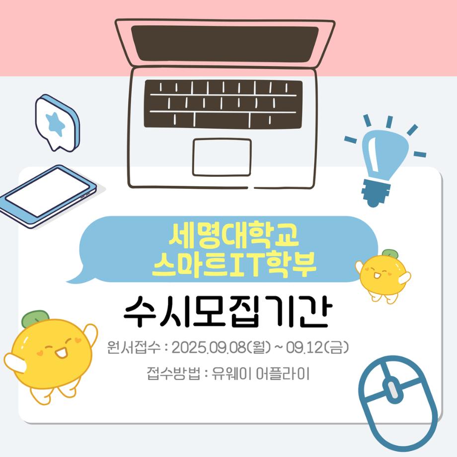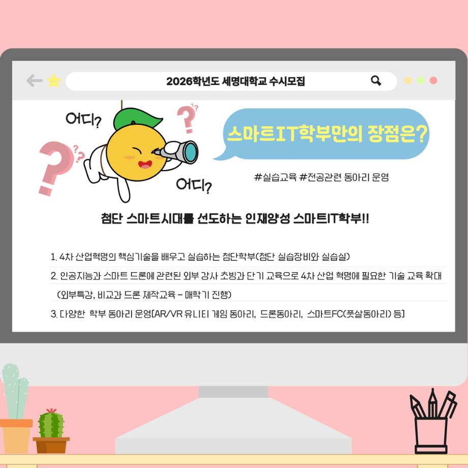 본문 시작 홈으로 SMIT 소식 SMIT 소개 SMIT 교육 SMIT 취업 SMIT 소식 SMIT 입학 홈페이지가이드 갤러리 공지사항 갤러리 경진대회 동아리 갤러리 페이스북 트위터 프린트 ◈ 스마트IT학부의 모든것🎶 ◈ 스마트IT학부 1716 2025-08-12 📢 스마트IT학부의 모든것!! - 내가알려줄게 🎉🎉 #세명대학교 #스마트IT학부 #드론 #카드뉴스 목록 이전2025 스마트IT학부 일보 다음 2024-후기 대학원 박사 학위수여식 담당부서 : 스마트IT학부 담당자 : - 연락처 : 043-649-1275 최종수정일 : 2024-10-26 만족도조사 만족도 조사 이 페이지에서 제공하는 정보에 대하여 만족하시나요? 매우만족 만족 보통 불만족 매우불만족