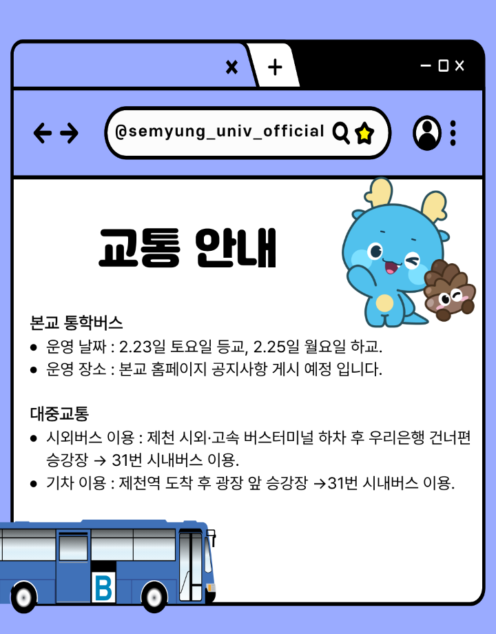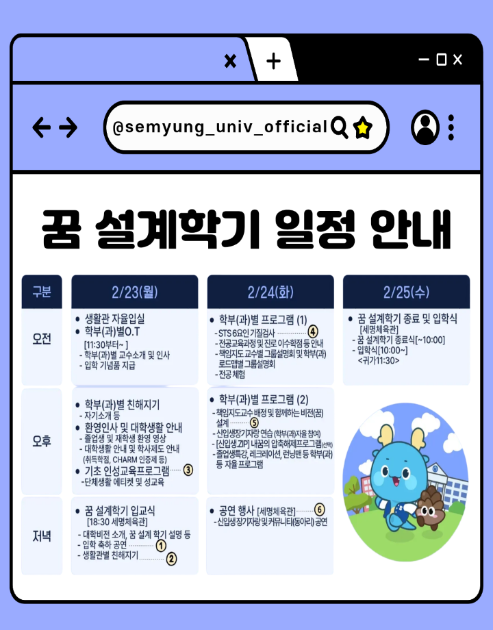 본문 시작 홈으로 SMIT 소식 SMIT 소개 SMIT 교육 SMIT 취업 SMIT 소식 SMIT 입학 홈페이지가이드 갤러리 공지사항 갤러리 경진대회 동아리 갤러리 페이스북 트위터 프린트 2026학년도 신입생 '꿈 설계학기오리엔테이션' 시행 안내 스마트IT학부 675 2026-02-13 2026학년도 신입생 '꿈 설계학기오리엔테이션' 시행 안내 목록 이전★ 2026학년도 정시모집 및 편입학모집 최초합격자 발표 일정 안내 ★ 다음 새해복 많이 받으세요! 담당부서 : 스마트IT학부 담당자 : - 연락처 : 043-649-1275 최종수정일 : 2024-10-26 만족도조사 만족도 조사 이 페이지에서 제공하는 정보에 대하여 만족하시나요? 매우만족 만족 보통 불만족 매우불만족