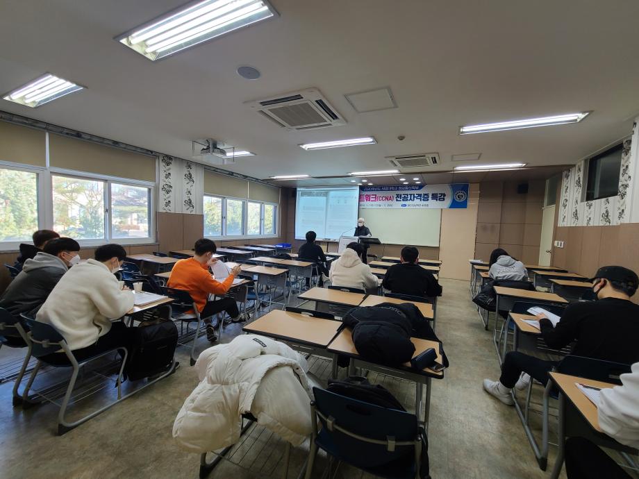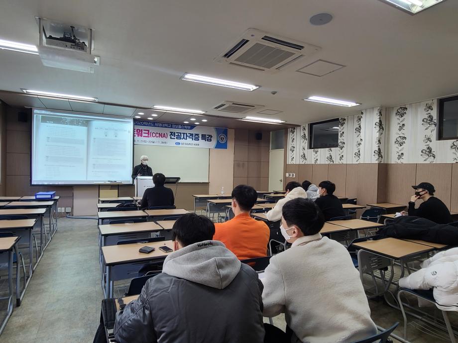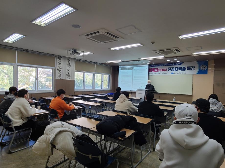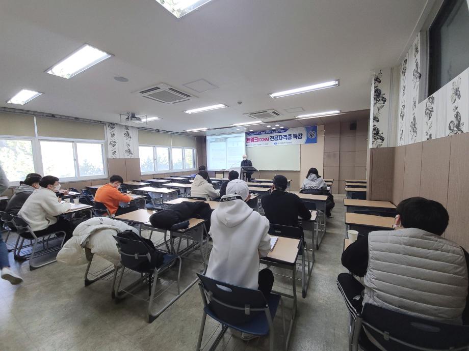 정보통신학부에서는 2020학년도 2학기 대면기간 중 3학년 재학생들을 대상으로 국제네트워크(CCNA) 자격증 특강을 진행하였다. CCNA(Cisco Certified Network Associate)는 시스코의 네트워크 기술 능력을 검증하는 네트워크 관련 자격증들 중에서 가장 기초적인 자격증으로 네트워크 관련 업무 수행을 위한 일반적인 운용지식과 구축기술 NOS운영, Packet분석, Monitoring, 인터넷기술, Protocol 등 기초 이론과 실무능력 등을 필요로 한다. 학생들은 전공자격증 특강을 통해 자격증을 보다 쉽게 취득할 수 있도록 도와주는 계기가 될 것으로 기대된다.