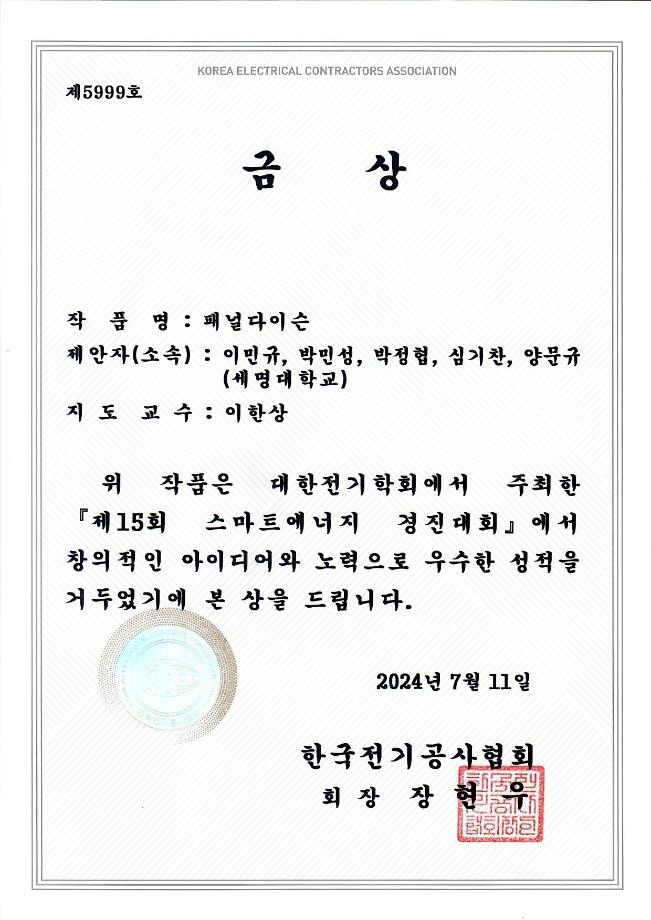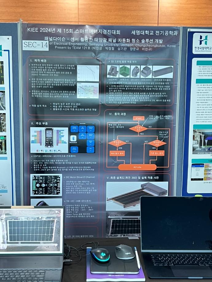 세명대학교 전기공학과 4학년 이민규, 박정협, 양문규, 심기찬, 박민성(지도교수 이한상)의 5명으로 구성된 캡스톤디자인팀(팀명 121호)는, 태양광 패널이 과열되거나 먼지로 오염된 경우 발전 효율이 낮아지는 점을 개선하기 위하여 온도센서와 먼지센서를 이용하여 패널의 온도를 낮추고 먼지를 제거하는 태양광 패널 발전효율 개선 장치(작품명: 패널다이슨)를 제작하여, 대한전기학회에서 주최하는 학부생 대상 스마트에너지경진대회에 참가하였고 전국에서 모인 30개 대학과 경쟁하여 금상(상금 60만원)을 수상하였다.