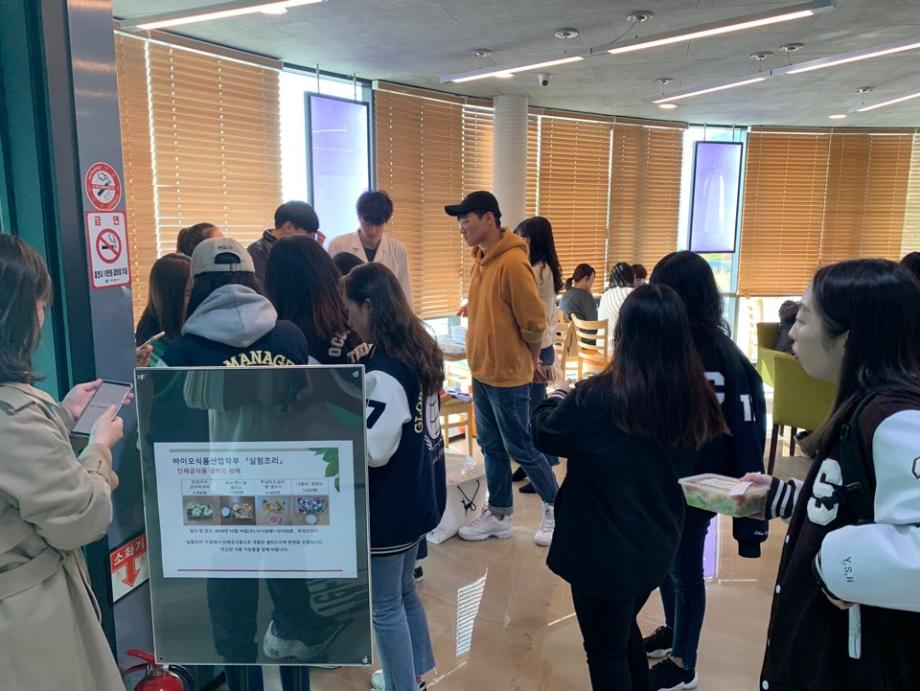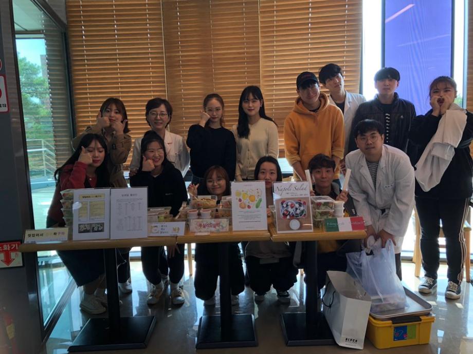 바이오식품산업학부는 ‘실험조리’ 수업의 일환으로 2019년 10월 16일(수) 교내 세네뜨리아에서 수업 중 단체급식용으로 개발된 4종의 샐러드를 판매하였다. 학생들은 조별로 메뉴를 디자인하고 영양소를 분석하였으며 종류에 따라 1인분에 3,000원~4,000원으로 가격을 책정하고 총 80셋트를 조리하였다. 비교적 저렴한 가격과 균형있는 영양소 공급을 목표로 예비영양사로서의 역량을 발휘한 기회가 되었으며 준비된 음식은 행사 1시간 만에 완판되었다. 학생들은 계획된 조리시간 맞추기, 식품 전처리, 급식 대상자들의 만족도 높이기 측면에서 영양사들의 애로사항도 체험하게 되었으며 이러한 경험은 향후 영양사 진로를 희망하는 학생들에게 현장을 경험할 수 있는 좋은 기회가 되었던 것으로 평가된다.