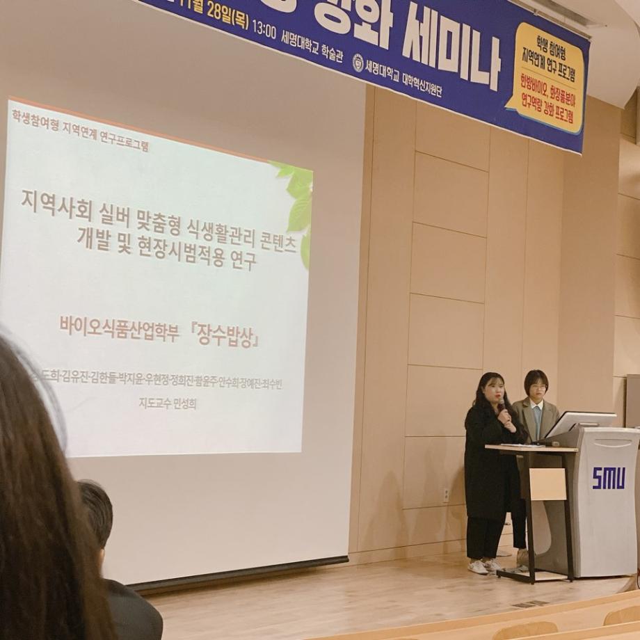 본문 시작 홈으로 커뮤니티 학부소개 진로·취업 교육과정 커뮤니티 대학원 입학상담 홈페이지가이드 갤러리 공지사항 문의게시판 학생회 전공동아리 동문회 갤러리 전공자료실 Youtube Instagram Facebook Blog 갤러리 페이스북 트위터 프린트 학생참여형 지역연계 연구 최종 발표 및 장려상 수상 바이오식품산업학부 6308 2019-12-02 2019년 11월 28일 (목) 학생참여형 지역연계연구 최종 발표회가 있었습니다. 우리 학부에서 참여한 '장수밥상'팀에서는 오후 1시30분부터 3시30분까지 학술관 로비에서 포스터 발표를 하였고 3시30분 부터는 학술관 102호에서 연구성과 제발표(발표자 3학년 우현정)를 하였고 장려상을 수상하였습니다 목록 이전학생경험중심 발표회 다음 [실험조리] 수강생 학부 발전기금 기부 담당부서 : 바이오식품산업학부 담당자 : - 연락처 : 043-649-1431 최종수정일 : 2024-10-26 만족도조사 만족도 조사 이 페이지에서 제공하는 정보에 대하여 만족하시나요? 매우만족 만족 보통 불만족 매우불만족