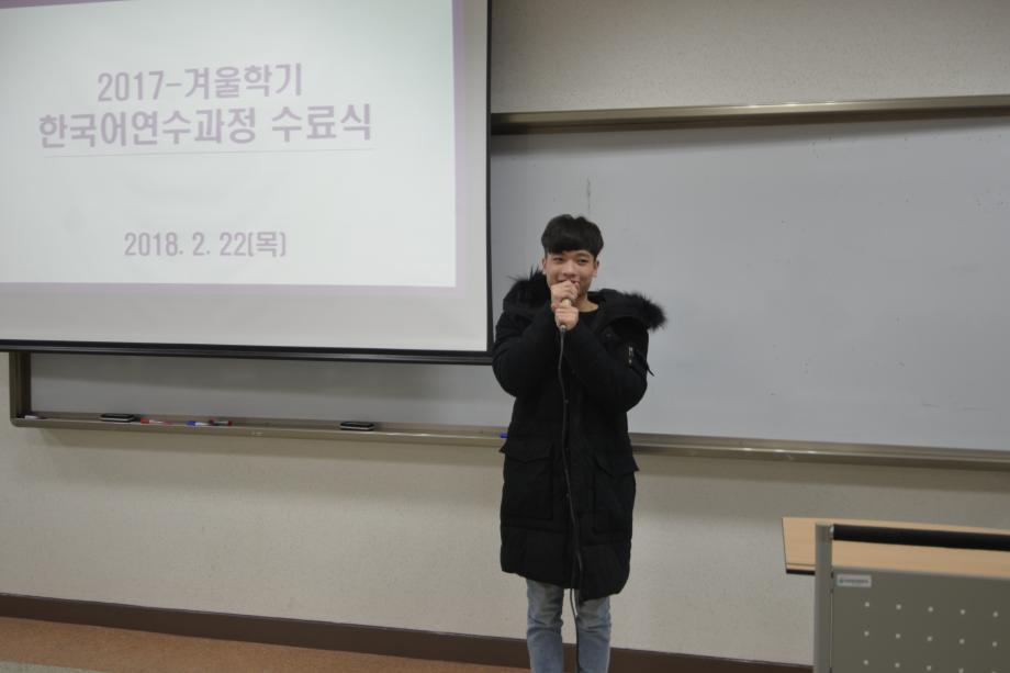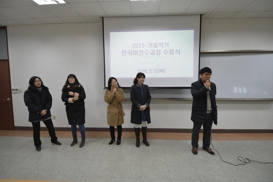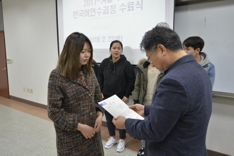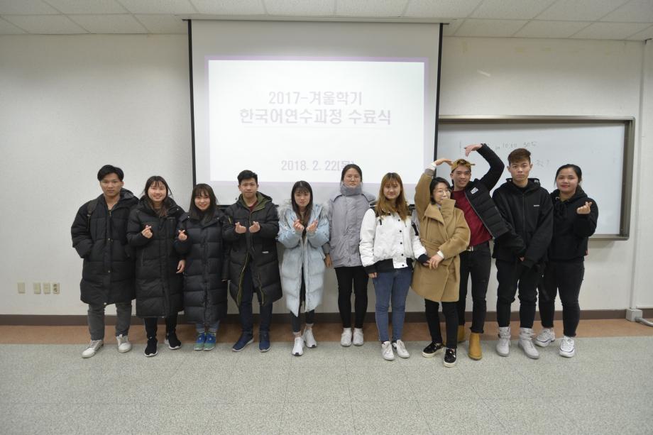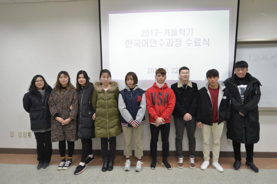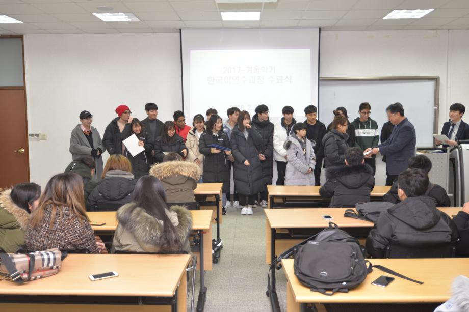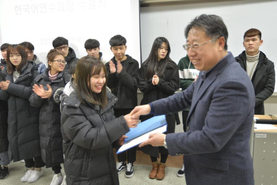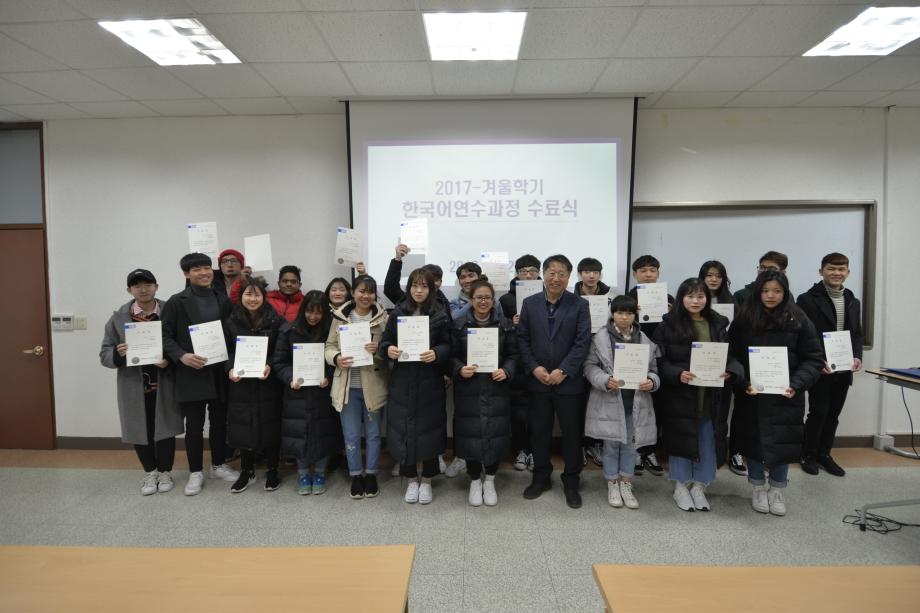 본문 시작 2017년 겨울학기 한국어 연수과정 수료식 국제교육원 5390 2018-02-22 2018년 02월 22일 국제교육원(처장 김창한)에서는 2017-겨울학기 한국어 연수과정 수료식을 진행하였습니다. 연수생들은 한 학기동안 많은 노력을 통해 TOPIK(한국어능력시험) 자격증 취득, 우수학생에 선정되는 등 학업성취를 이루었습니다. 본과에 진학하는 학생들과 연수과정이 남은 학생들 모두 더욱 정진하는 자세를 통해 발전하기를 기원합니다. 목록 이전2017 겨울학기 한국어연수생 설맞이 간담회 다음 2018 봄학기 한국어 연수과정 개강식 담당부서 : 국제교육원 담당자 : - 연락처 : 043-649-1185 최종수정일 : 2024-10-26 만족도조사 만족도 조사 이 페이지에서 제공하는 정보에 대하여 만족하시나요? 매우만족 만족 보통 불만족 매우불만족