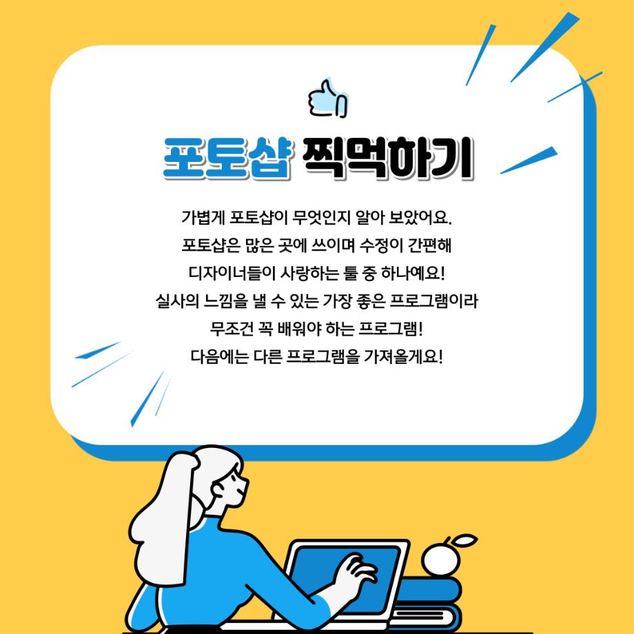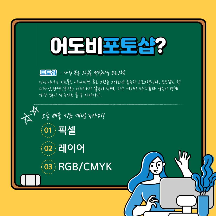 본문 시작 홈으로 학과자랑 학과소개 학과과정 시영소식 입학/취업 AI 학과자랑 SNS소통 홈페이지가이드 갤러리 학과자랑 갤러리 공모전 동아리 졸업전시회 갤러리 페이스북 트위터 프린트 예비 대학생을 위한 디자인 프로그램 설명 2탄 (포토샵) 시각영상디자인학과 2322 2022-02-07 1학년때 배우는 디자인 툴 포토샵입니다. 목록 이전예비 대학생을 위한 디자인 프로그램 설명 1탄 (일러스트레이터) 다음 예비 대학생을 위한 디자인 프로그램 설명 3탄 (애프터이펙트) 담당부서 : 시각영상디자인학과 담당자 : - 연락처 : 043-649-1726 최종수정일 : 2024-10-26 만족도조사 만족도 조사 이 페이지에서 제공하는 정보에 대하여 만족하시나요? 매우만족 만족 보통 불만족 매우불만족