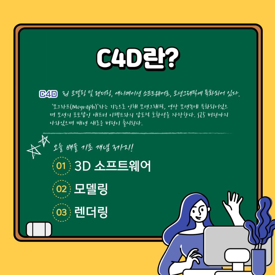 본문 시작 홈으로 학과자랑 학과소개 학과과정 시영소식 입학/취업 AI 학과자랑 SNS소통 홈페이지가이드 갤러리 학과자랑 갤러리 공모전 동아리 졸업전시회 갤러리 페이스북 트위터 프린트 예비 대학생을 위한 디자인 프로그램 설명 7탄 (Cinema 4D) 시각영상디자인학과 2268 2022-02-13 2학년 2학기에 배우는 시네마4d 입니다. 목록 이전예비 대학생을 위한 디자인 프로그램 설명 6탄 (XD) 다음 예비 대학생을 위한 디자인 프로그램 설명 8탄 (3D Max) 담당부서 : 시각영상디자인학과 담당자 : - 연락처 : 043-649-1726 최종수정일 : 2024-10-26 만족도조사 만족도 조사 이 페이지에서 제공하는 정보에 대하여 만족하시나요? 매우만족 만족 보통 불만족 매우불만족