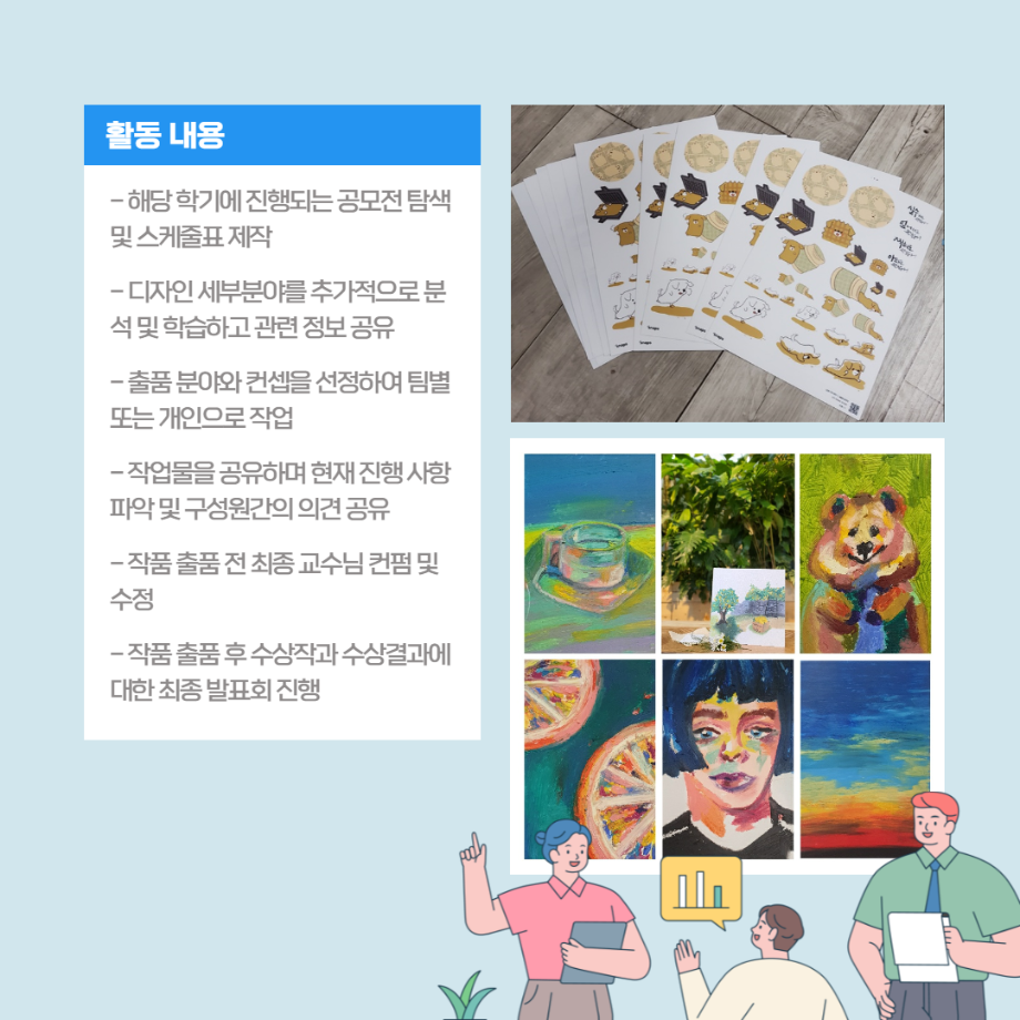 본문 시작 홈으로 학과자랑 학과소개 학과과정 시영소식 입학/취업 AI 학과자랑 SNS소통 홈페이지가이드 갤러리 학과자랑 갤러리 공모전 동아리 졸업전시회 갤러리 페이스북 트위터 프린트 시각영상동아리 알아보자! (디자인붐편) 시각영상디자인학과 3657 2022-02-13 목록 이전시각영상동아리 알아보자! (청풍면) 다음 귀여운 세명대 마스코트 이모티콘! 담당부서 : 시각영상디자인학과 담당자 : - 연락처 : 043-649-1726 최종수정일 : 2024-10-26 만족도조사 만족도 조사 이 페이지에서 제공하는 정보에 대하여 만족하시나요? 매우만족 만족 보통 불만족 매우불만족