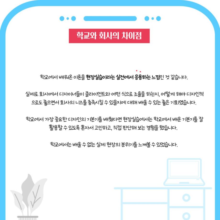 본문 시작 홈으로 학과자랑 학과소개 학과과정 시영소식 입학/취업 AI 학과자랑 SNS소통 홈페이지가이드 갤러리 학과자랑 갤러리 공모전 동아리 졸업전시회 갤러리 페이스북 트위터 프린트 2022년 여름방학 현장실습 알아보기! 2탄 시각영상디자인학과 4742 2022-08-03 2022년 여름방학 현장실습 알아보기! 2탄 유튜브 링크 https://www.youtube.com/watch?v=4CEG3-eYjWE&t=25s [출처] 2022년 여름방학 현장실습 알아보기! 2탄|작성자 세명대학교시각영상 목록 이전세명대학교 시각영상디자인 학생들의 현장실습 1탄 다음 세명대학교만의 특별한 휴식공간 담당부서 : 시각영상디자인학과 담당자 : - 연락처 : 043-649-1726 최종수정일 : 2024-10-26 만족도조사 만족도 조사 이 페이지에서 제공하는 정보에 대하여 만족하시나요? 매우만족 만족 보통 불만족 매우불만족