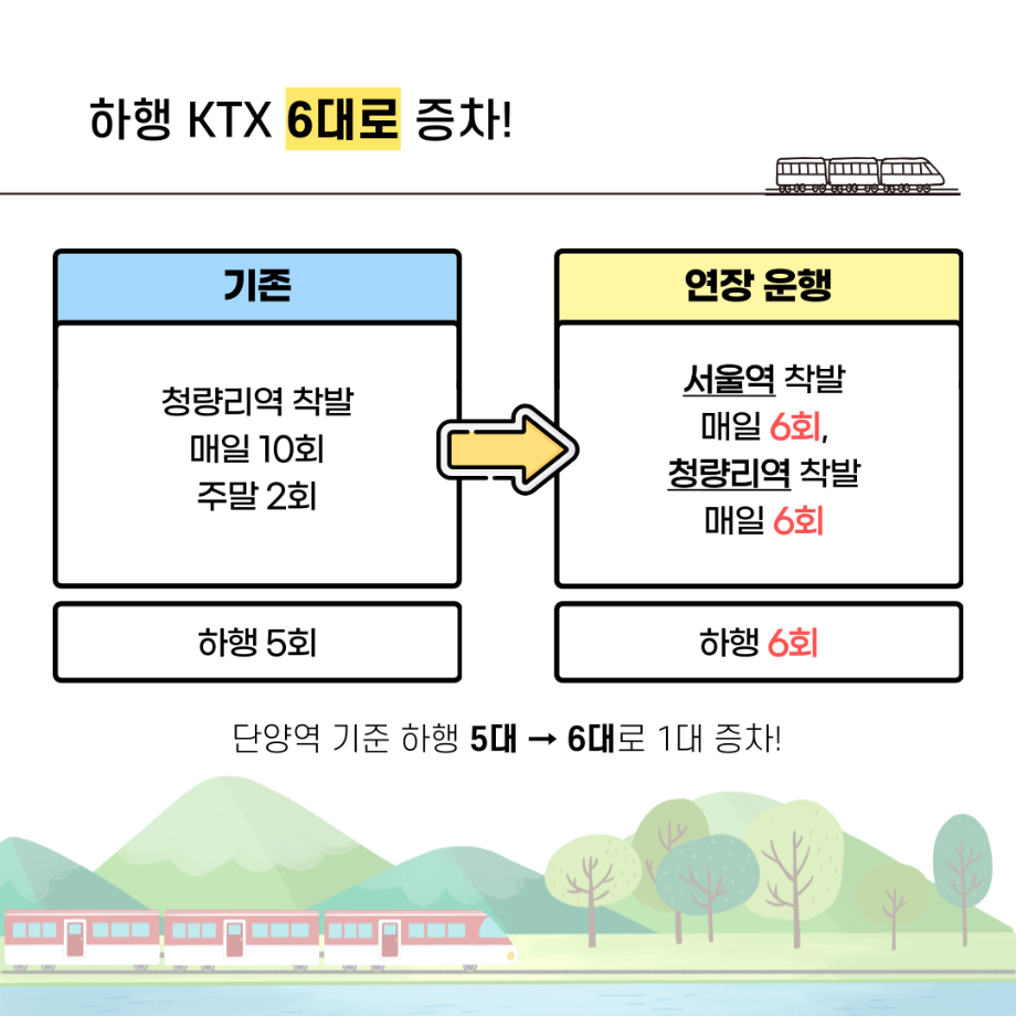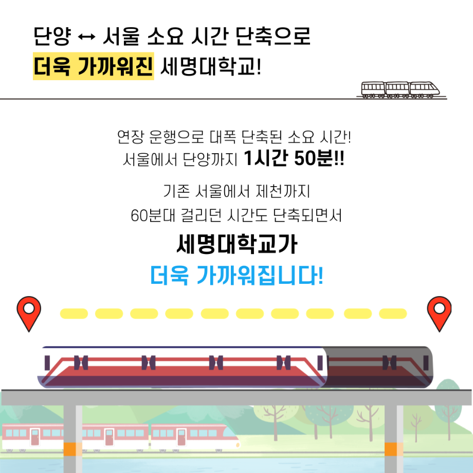 본문 시작 홈으로 학과자랑 학과소개 학과과정 시영소식 입학/취업 AI 학과자랑 SNS소통 홈페이지가이드 갤러리 학과자랑 갤러리 공모전 동아리 졸업전시회 갤러리 페이스북 트위터 프린트 KTX중앙선 연장 안내 시각영상디자인학과 2201 2023-12-28 12/29 부터 제천, 단양을 지나는 중앙선 KTX가 서울역까지 연장됩니다! 열차 또한 증차되고, 단양↔서울간 소요 시간도 단축되면서 세명대↔서울간 소요 시간도 단축됩니다 편리한 통학과 함께 더욱 가까워진, 재미있는 경험 가득한 세명대학교로 오세요! 목록 이전제32회 대전디자인어워드 특별상 다음 2023년 시각영상디자인학과 공모전 수상 실적 담당부서 : 시각영상디자인학과 담당자 : - 연락처 : 043-649-1726 최종수정일 : 2024-10-26 만족도조사 만족도 조사 이 페이지에서 제공하는 정보에 대하여 만족하시나요? 매우만족 만족 보통 불만족 매우불만족