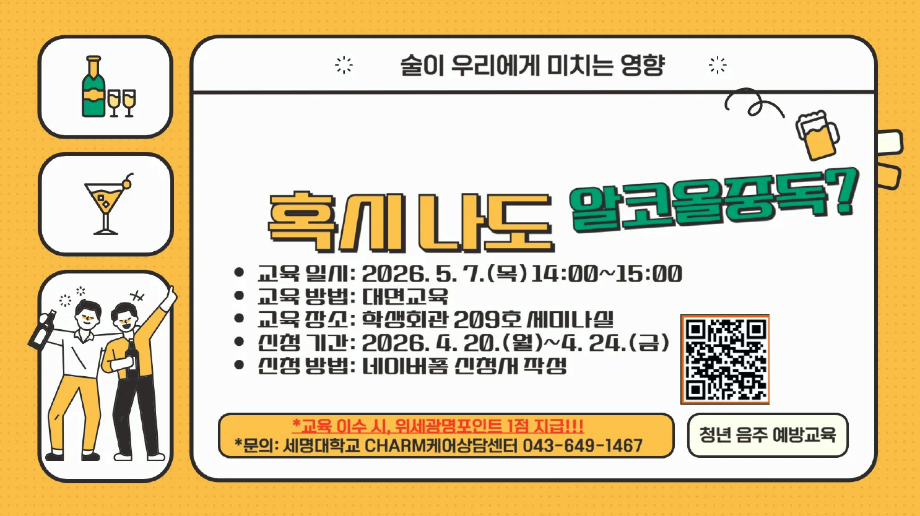 본문 시작 홈으로 학과생활 학과소개 교수소개 교과과정 학과생활 홈페이지가이드 사진게시판 공지사항 사진게시판 전공자료실 동아리 학과행사 사진게시판 페이스북 트위터 프린트 [CHARM케어상담센터 ] 2026학년도 1학기 알코올중독 예방교육 실시 아트앤산업디자인학과 24 2026-04-20 목록 이전[취창업처] [2026대일플] 졸업(예정)자 대상 고용노동부 [국민취업지원제도] 사업 안내 담당부서 : 산업디자인학과 담당자 : - 연락처 : 043-649-1436 최종수정일 : 2024-10-26 만족도조사 만족도 조사 이 페이지에서 제공하는 정보에 대하여 만족하시나요? 매우만족 만족 보통 불만족 매우불만족