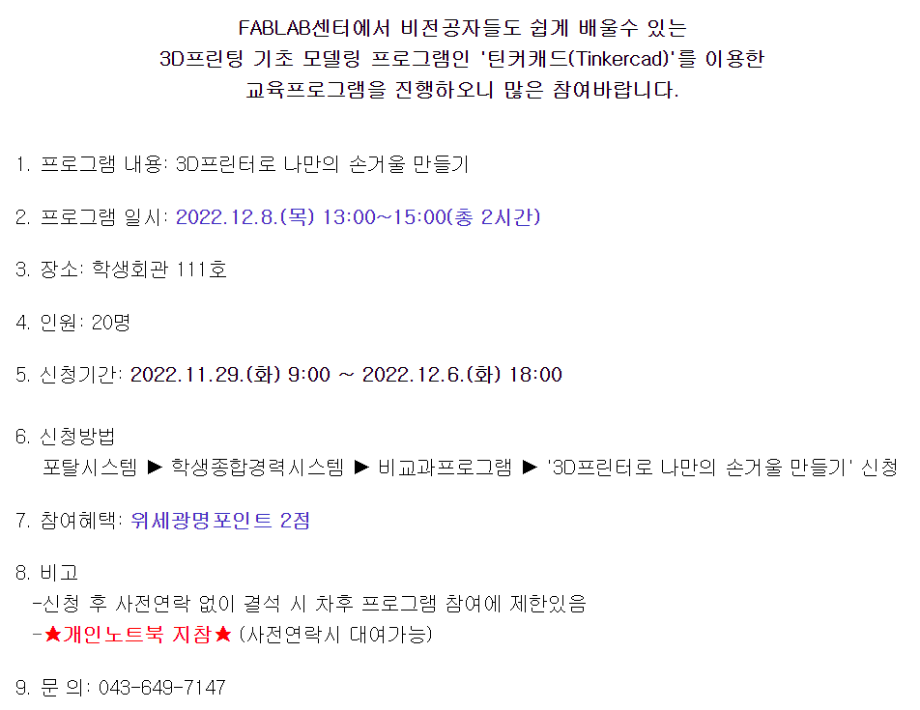 본문 시작 홈으로 학과생활 학과소개 교수소개 교과과정 학과생활 홈페이지가이드 사진게시판 공지사항 사진게시판 전공자료실 동아리 학과행사 사진게시판 페이스북 트위터 프린트 [FABLAB] 3D 프린터로 나만의 손거울 만들기 산업디자인학과 2853 2022-11-29 목록 이전[학술특강]성공하는 디자인 조건_Hitachi-LG DATA 디자인팀_우*호 팀장 다음 [FABLAB] 3D프린터를 활용한 지역-대학 협력형 평생교육 담당부서 : 산업디자인학과 담당자 : - 연락처 : 043-649-1436 최종수정일 : 2024-10-26 만족도조사 만족도 조사 이 페이지에서 제공하는 정보에 대하여 만족하시나요? 매우만족 만족 보통 불만족 매우불만족