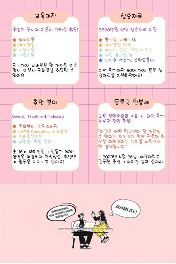 깔끔한 실습실과 아낌없이 지원해주는 세명대학교 뷰티케어학과에서 여러분의 꿈을 펼쳐보는건 어떠신가요~?